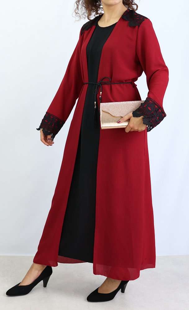 Veste Manteau femme avec ceinture intégrée (Tunique Automne Hiver - Boutique Vêtement Hijab Turque en ligne) - Couleur noir et bordeaux - REF. 35327 (19.90 €)
