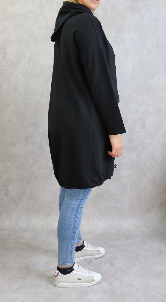 Veste zippée, manches longues, capuche avec lien de serrage ainsi qu'en bas du vêtement, poches plaquées à rabats. Coupe droite, matière sweat agréable à porter.