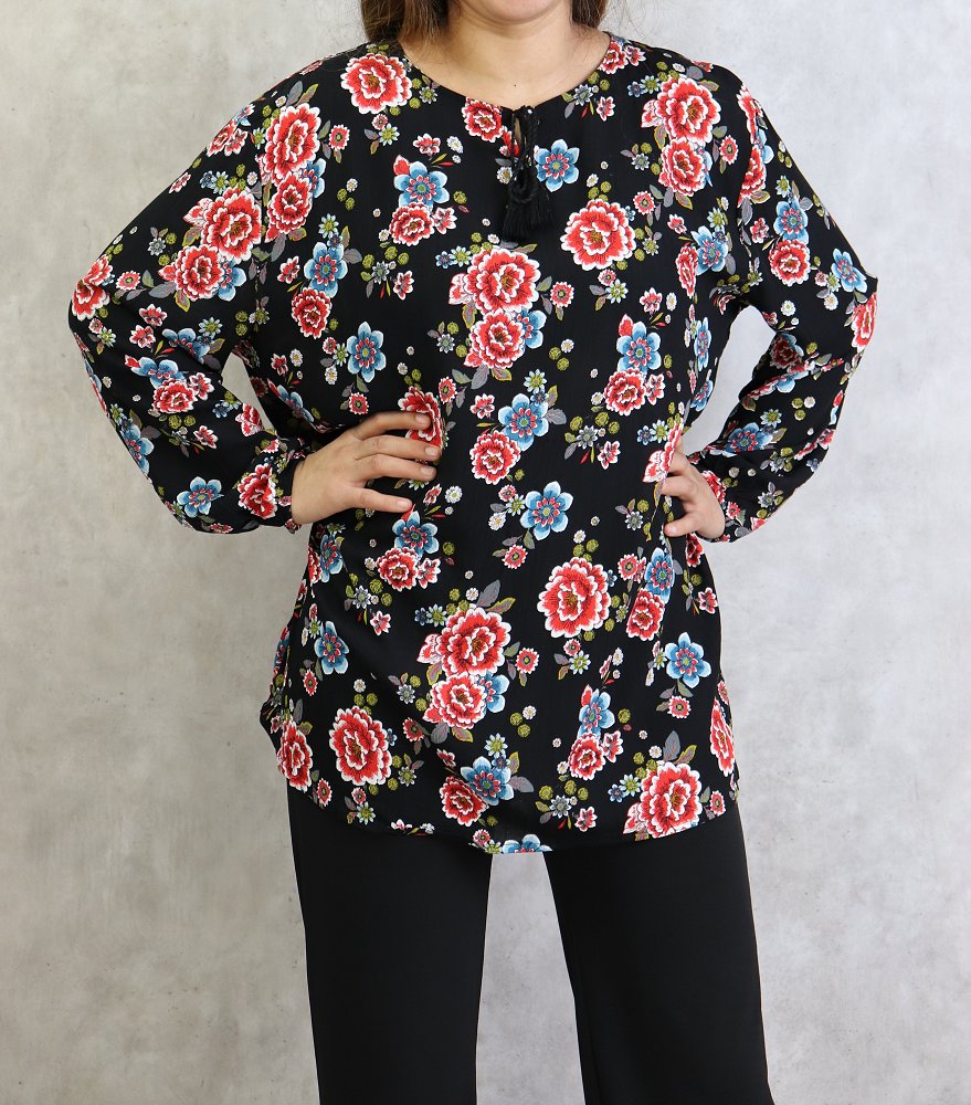 Tunique courte, col dégagé, lien de serrage, manches longues finition élastiques aux poignets. Coupe droite, tissu fluide et léger.