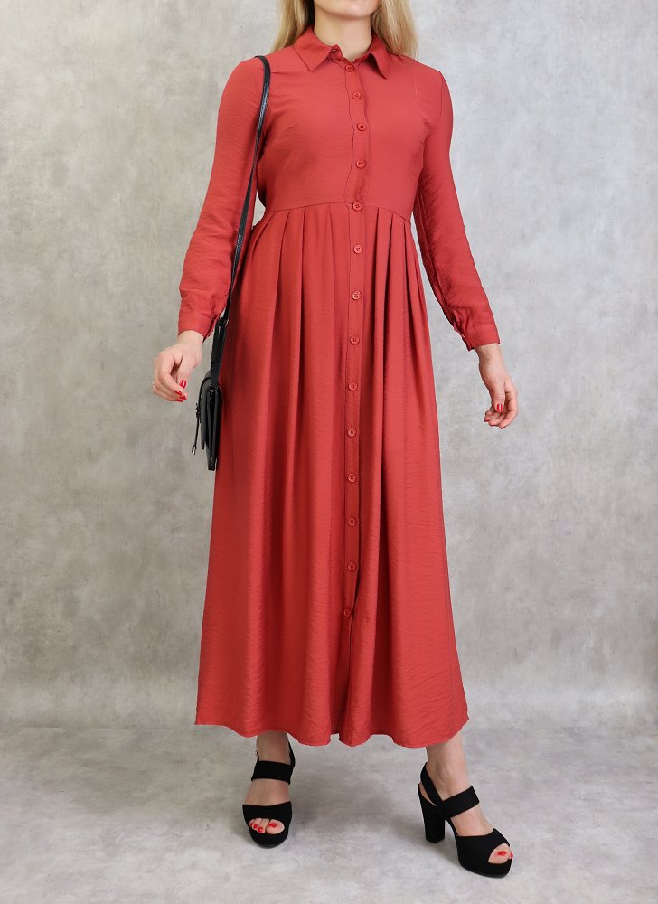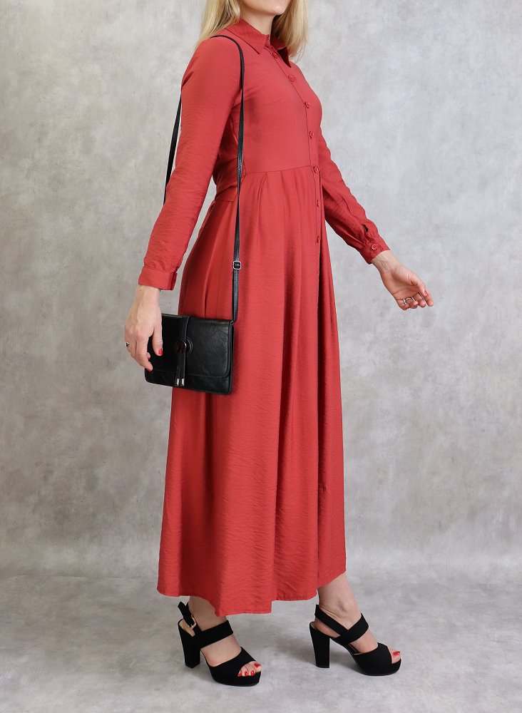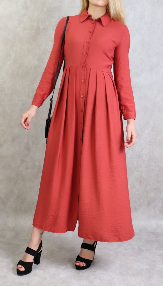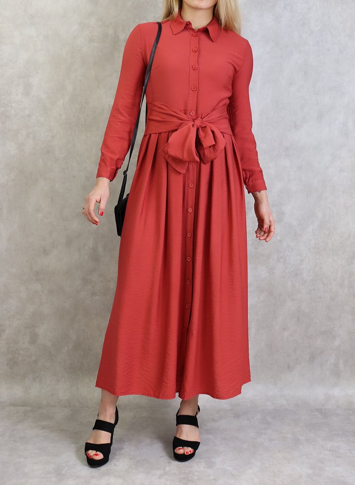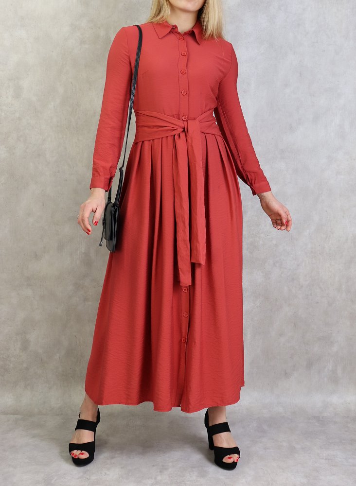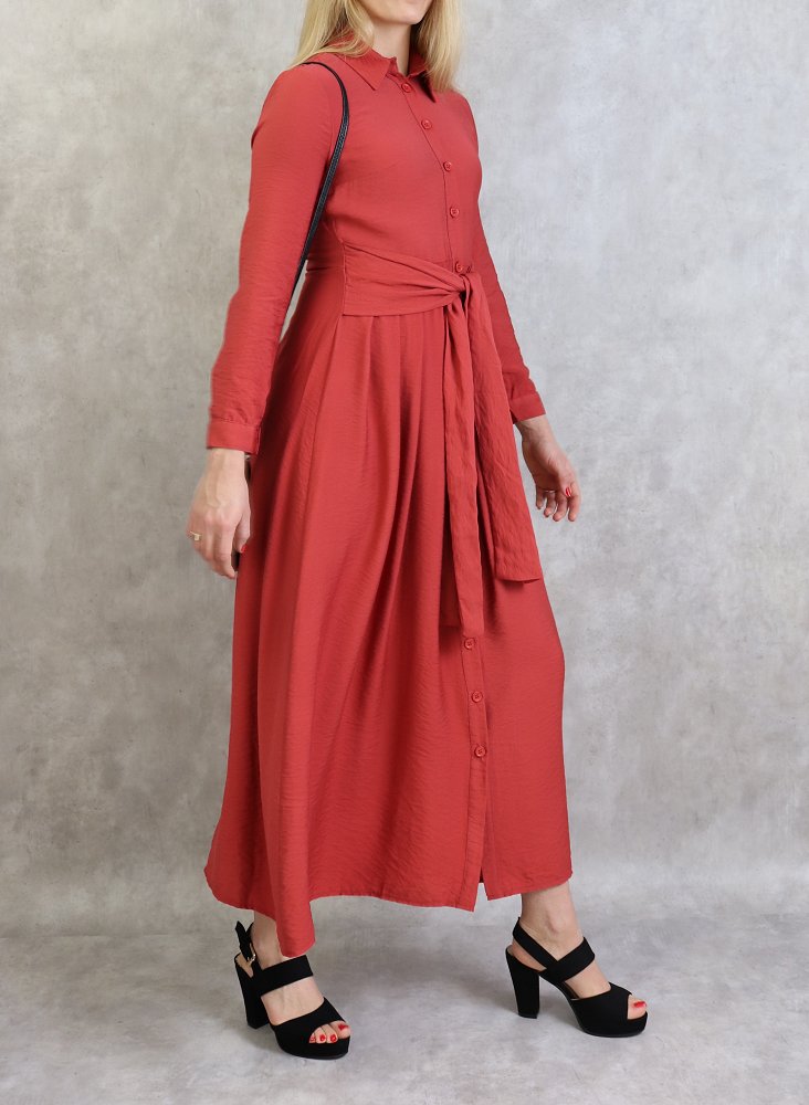 Robe longue, col chemise, boutons sur tout la longueur, manches longues finition boutons aux poignets, taille cintrée, ceinture assortie avec deux lien large collé à la taille attacher à lavant ou à l arrière. Coupe légèrement évasée, tissu opaque et léger.