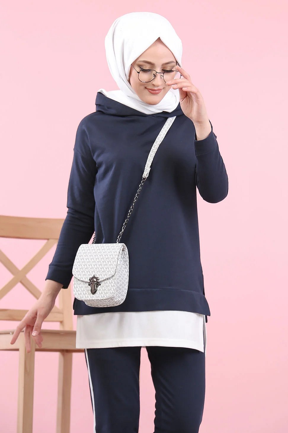 Survêtement deux pièces composé d'un sweat à capuche, coupe droite et d'un pantalon taille élastique. Le Sweat-shirt est rallongé avec extension de couleur blanche.