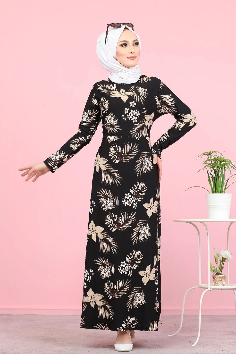 Robe longue légèrement cintrée à la taille, col rond, manches longues.