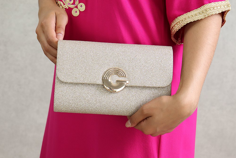 Pochette et Sac bandoulière pailleté. Rabat fermé par pression magnétique avec logo sous forme de G en métal. Une fine bandoulière en métal amovible complète ce modèle et permet de la porter aussi en bandoulière. Une petite poche de service permet de ranger vos clés ou de petits objets.