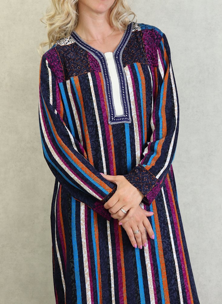 Robe manches longues, rayures verticales multi couleur, ornée d'une languette brodé sur le devant. Coupe droite, elle est douce et agréable à porter.