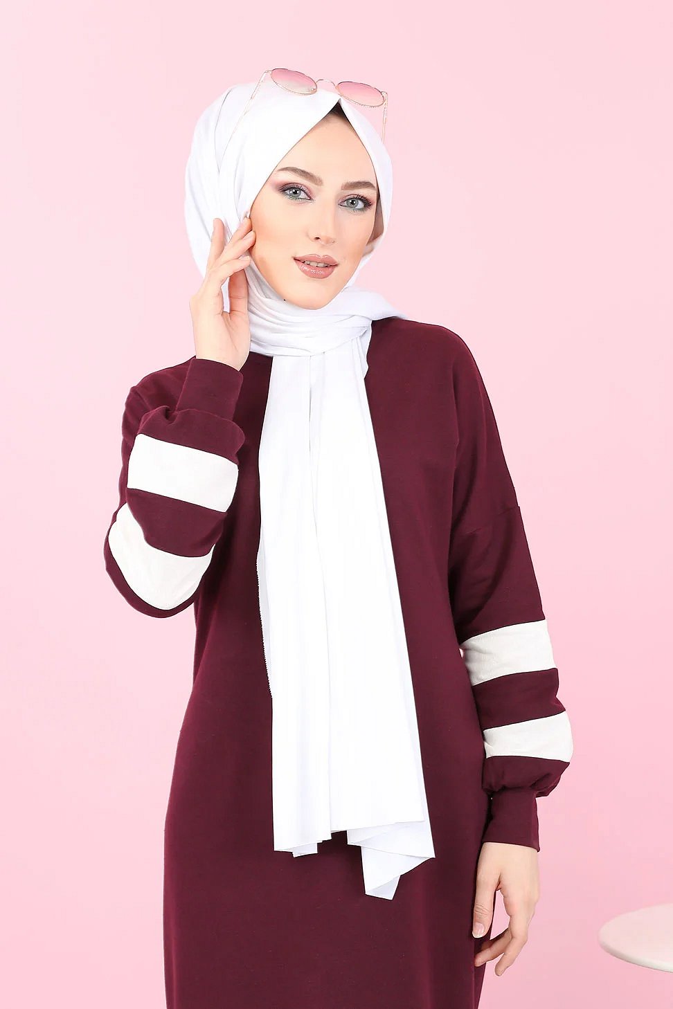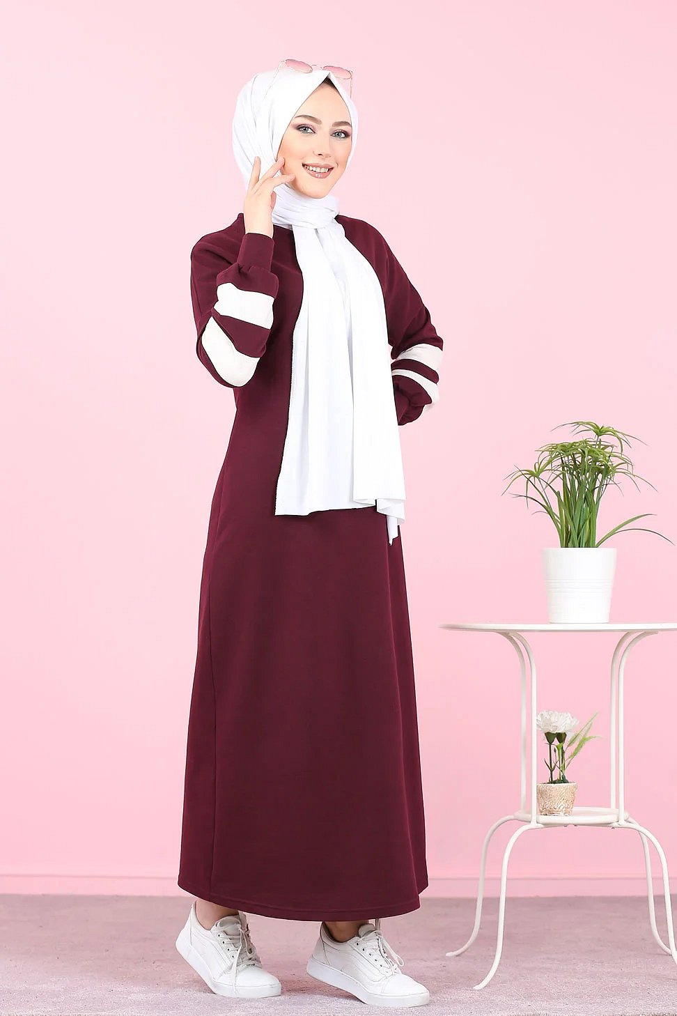Robe longue, col rond, manches longues légèrement bouffantes, coupe droite.