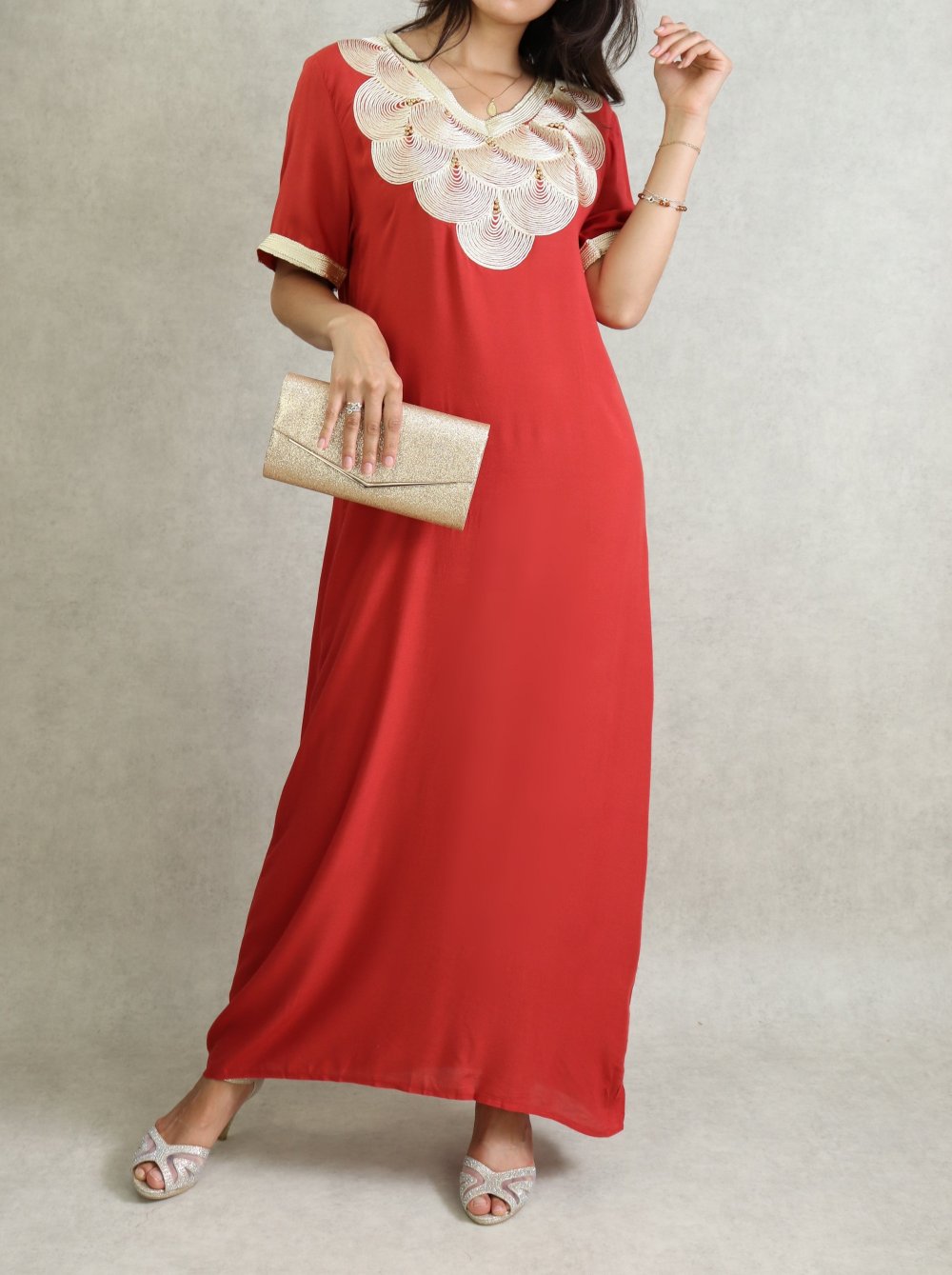 Robe orientale algérienne à manches courte brodée et perlée pour femme - Couleur coquelicot - REF. 33586 (29.00 €)