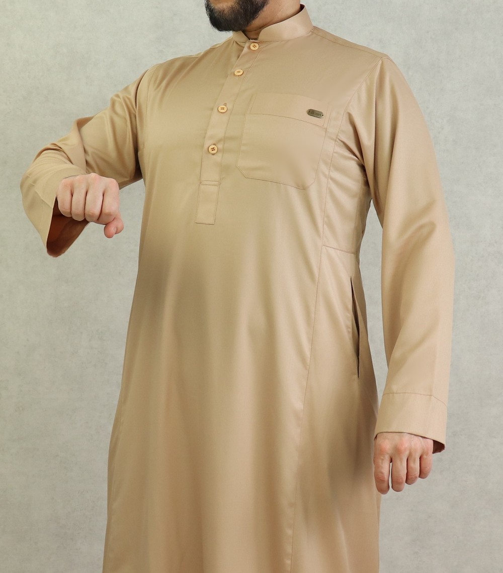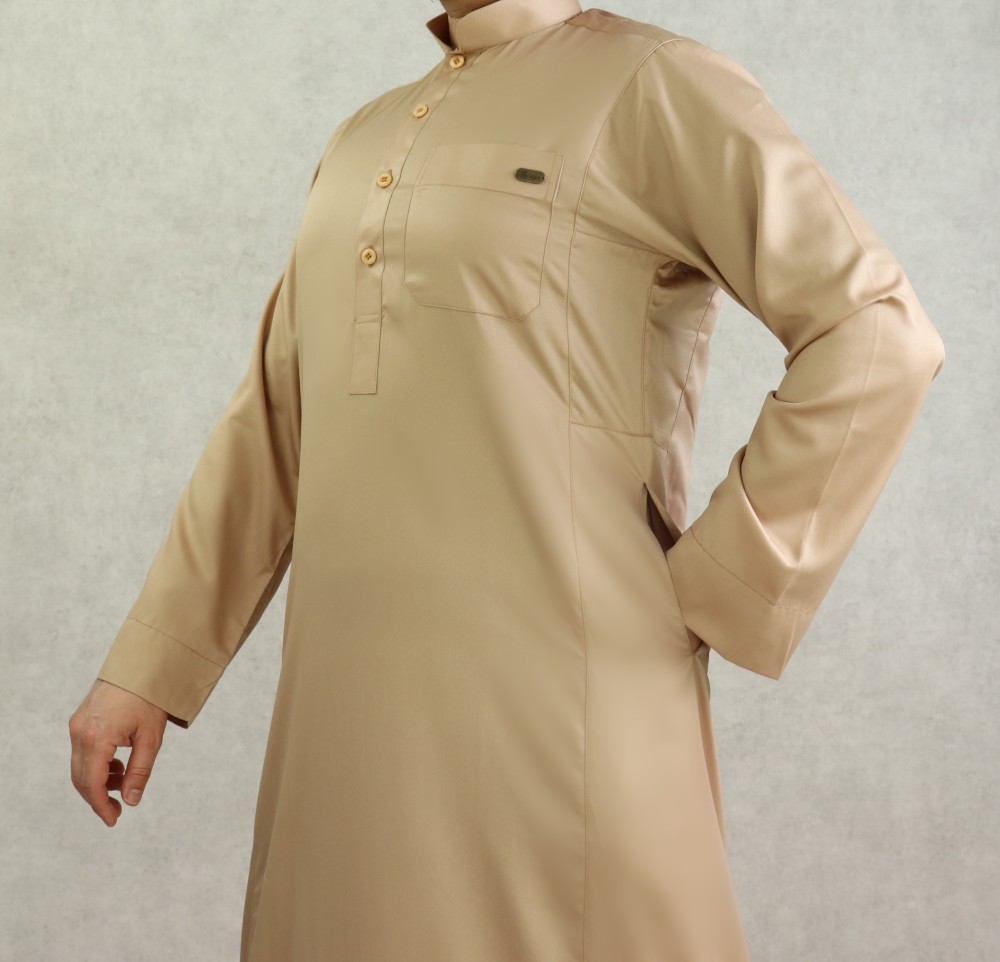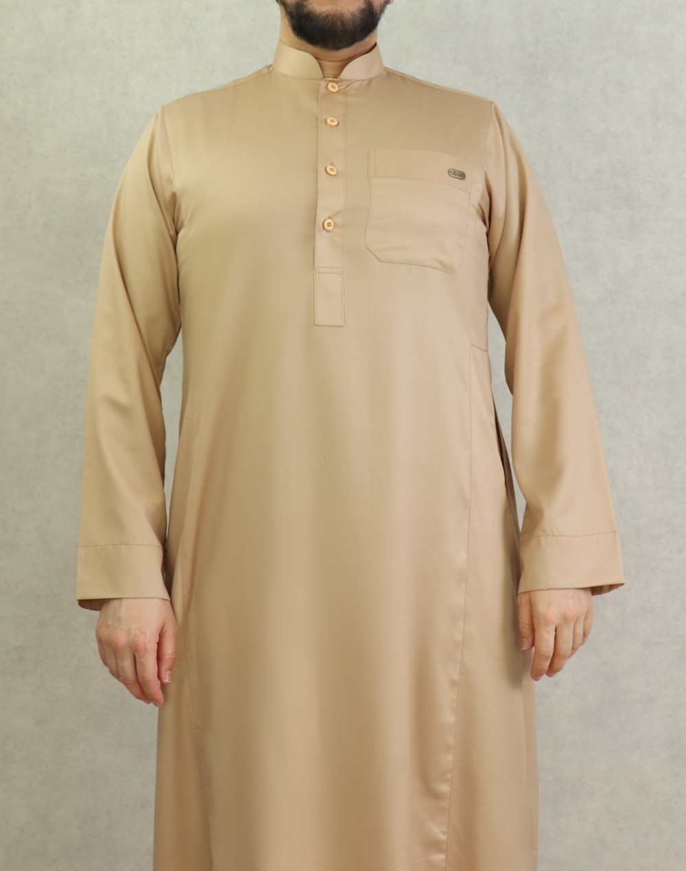 Qamis long manches longues fermeture boutons au niveau de la poitrine. Tissu fluide et très agréable de qualité supérieure, toutes saisons. Très bonnes coutures et finitions. Poche au niveau de la poitrine et deux grandes poches latérales avec sous-poches internes (pour clés ou petits objets).