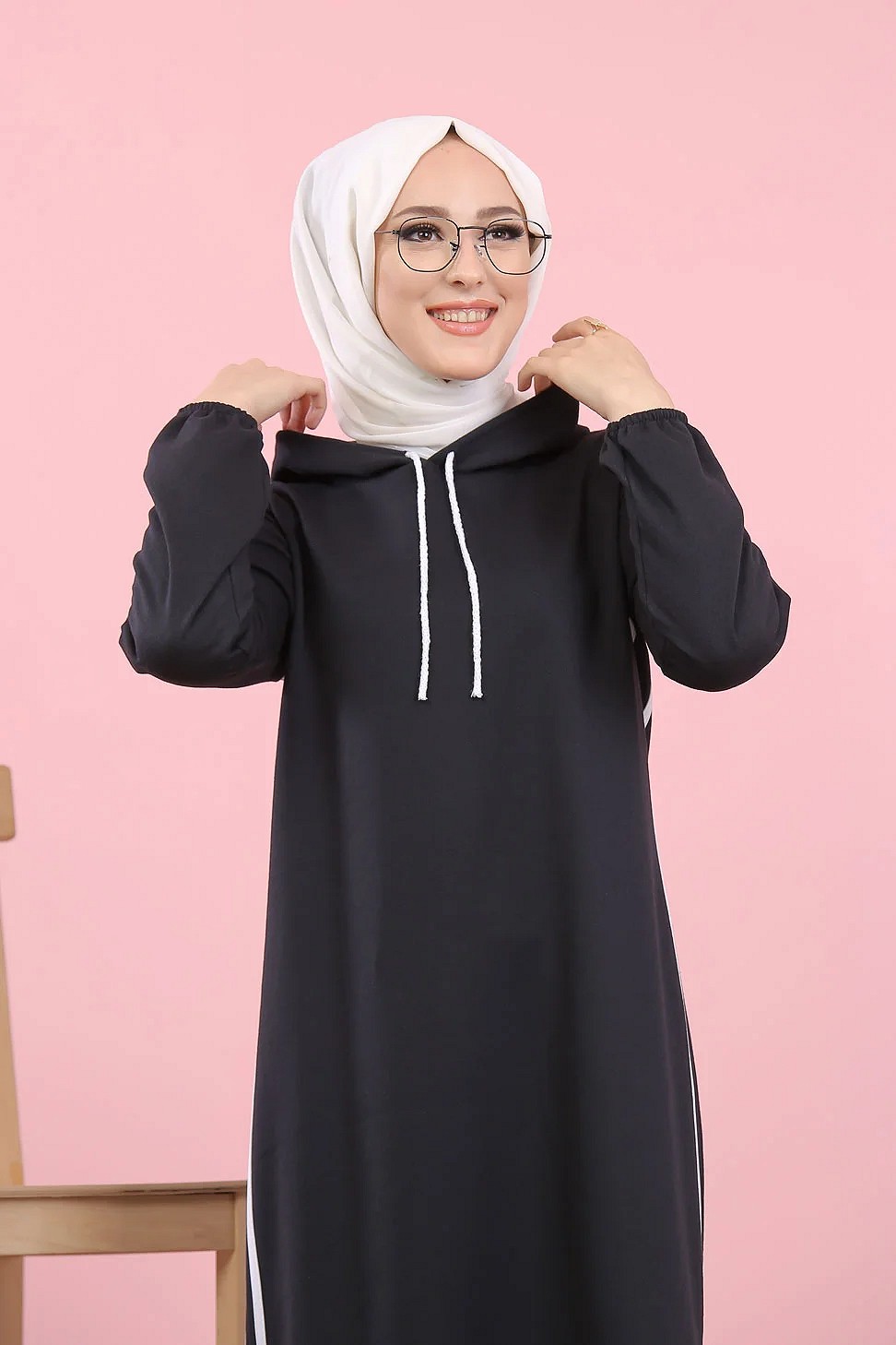 Laissez-vous séduire par cette robe longue sweatshirt ultra tendance conçue en coton mélangé uni, offrant douceur et confort dont vous ne pourrez plus vous passer. Dotée d’une capuche, et de deux traits blancs sur les côtés sur toute la longue de la robe... Modèle avec finition élastique à la base et en bas des manches longues.