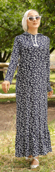Robe longue à capuche finition volante à motifs feuilles nénuphar - Couleur bleu marine - REF. 34016 (25.00 €) - En Promotion à 19.90 €