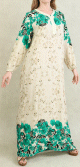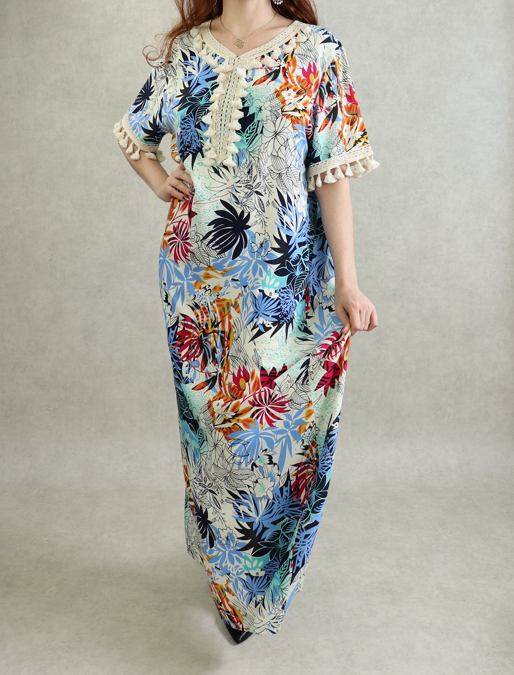 Robe longue d'été ou pour la maison à imprimé exotique pour femme, manches courtes avec broderies et pompons beige, coupe droite, tissu fluide et doux au toucher coton.