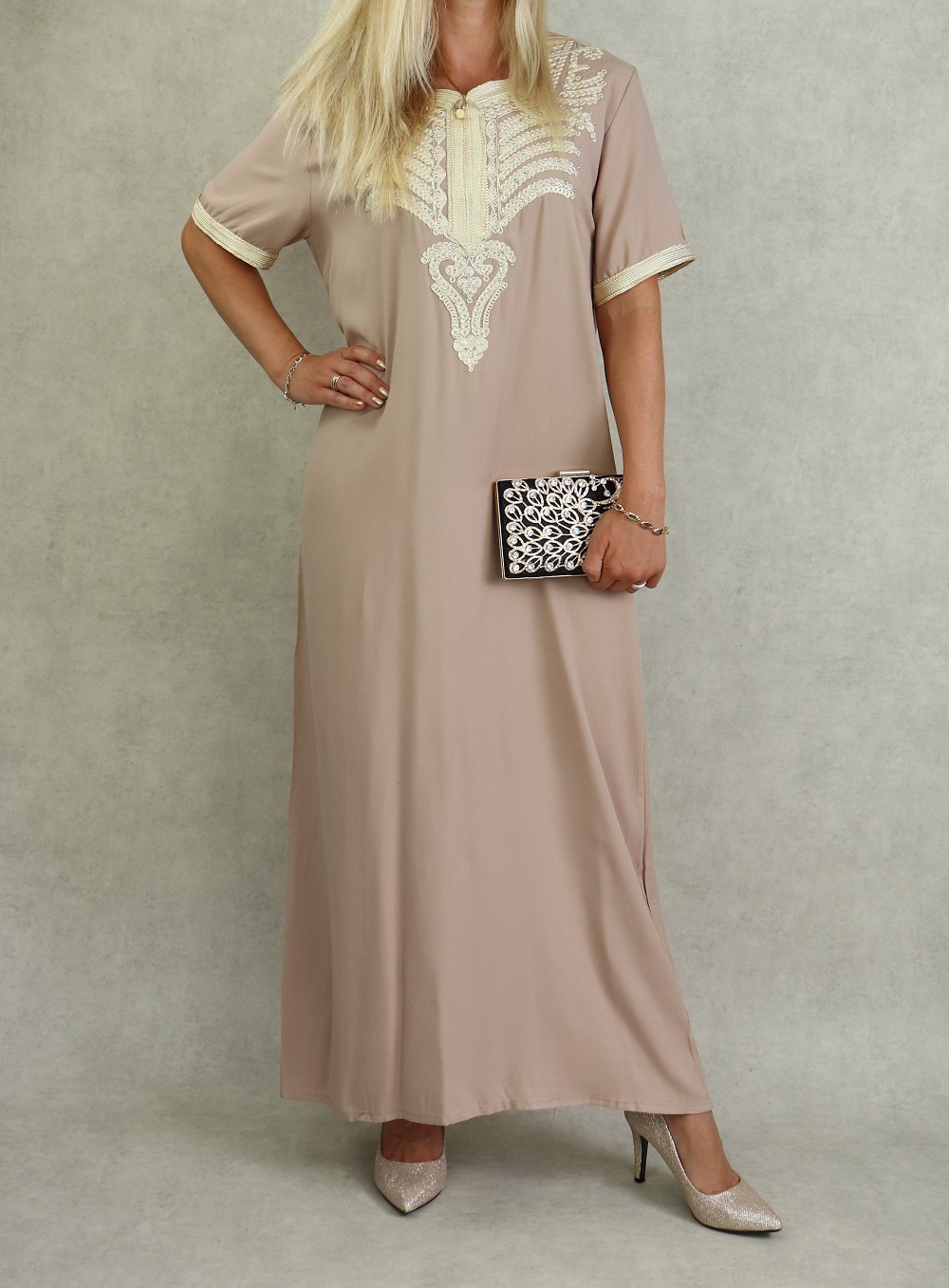Cette robe orientale à manches courtes, encolure en cœur, tissu doux et léger type coton, vous donnera une allure incroyable.