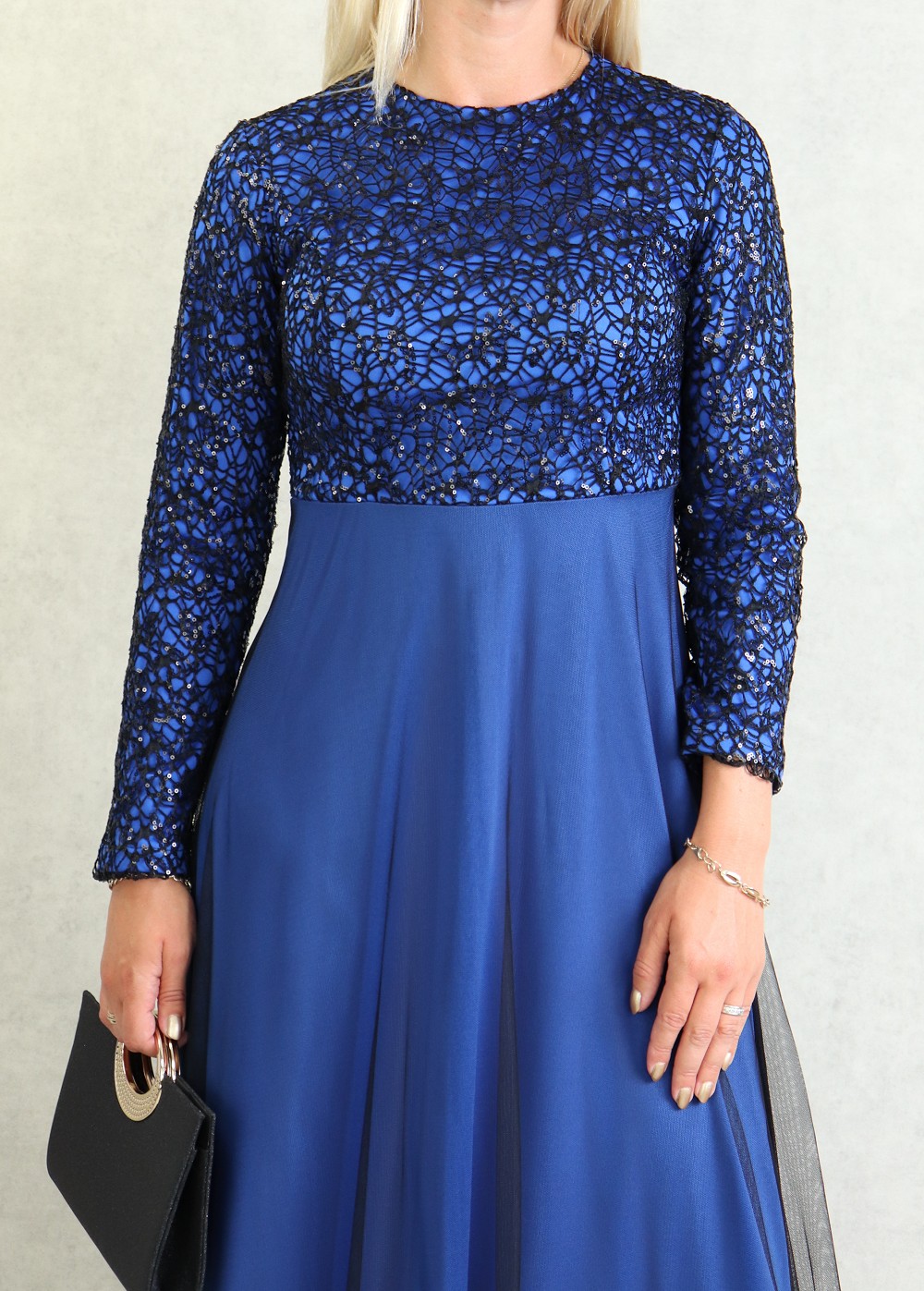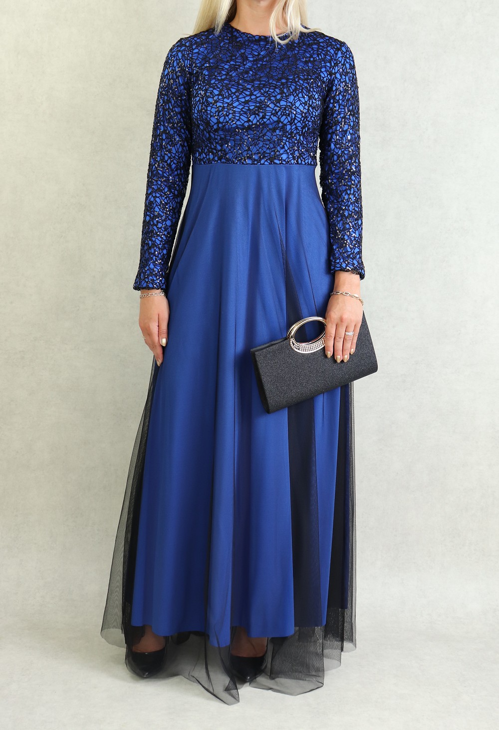 Robe de soirée maxi-longue haut brillant à manches longues - Couleur Bleu marine - REF. 30929 (39.00 €)
