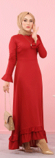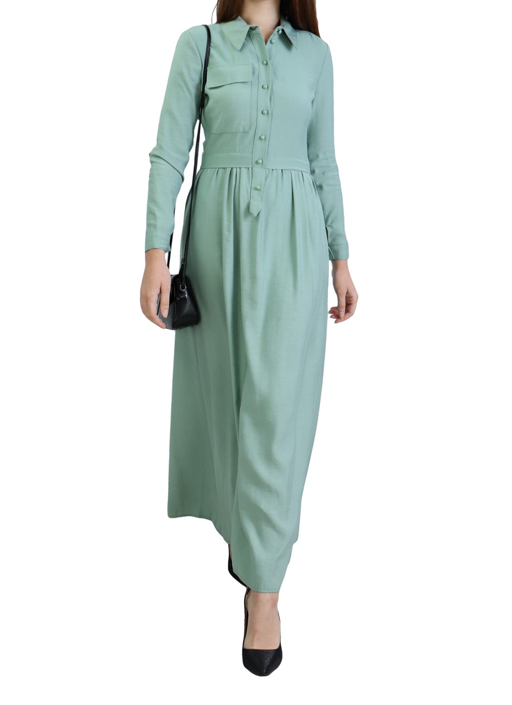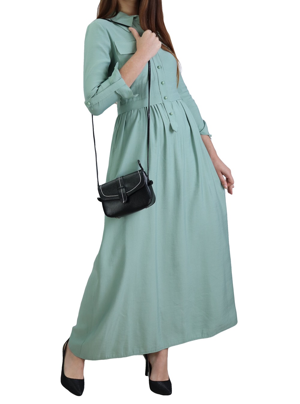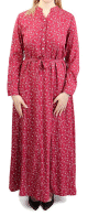 Robe longue, col chemise, fermeture bouton sur le buste, manches retroussables finition bouton aux poignets, avec une poche plaquée et deux poches latérales. Coupe évasée. Tissu très agréable à porter en toutes saisons.