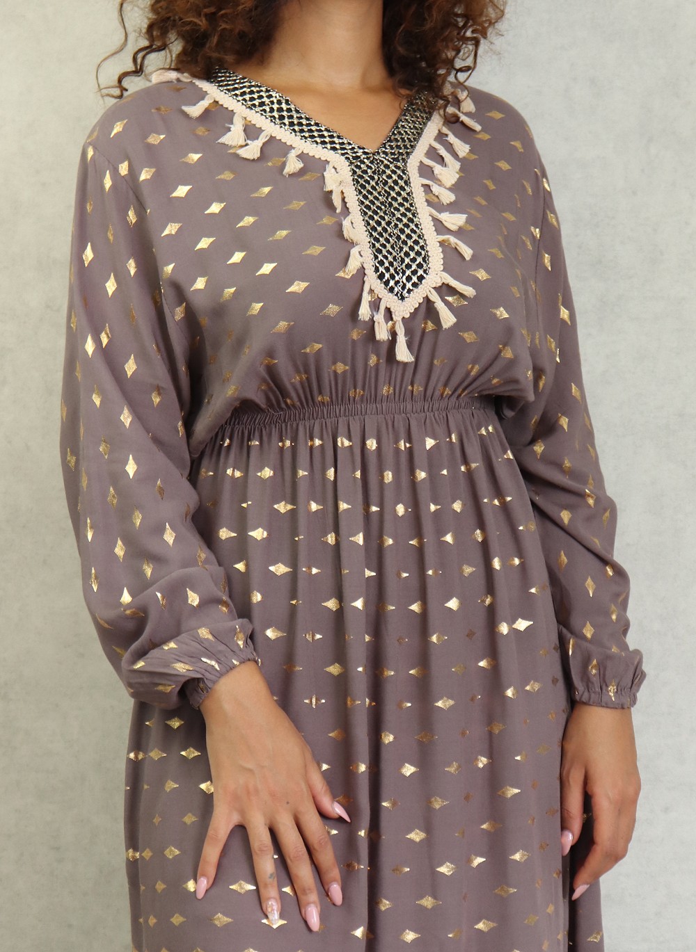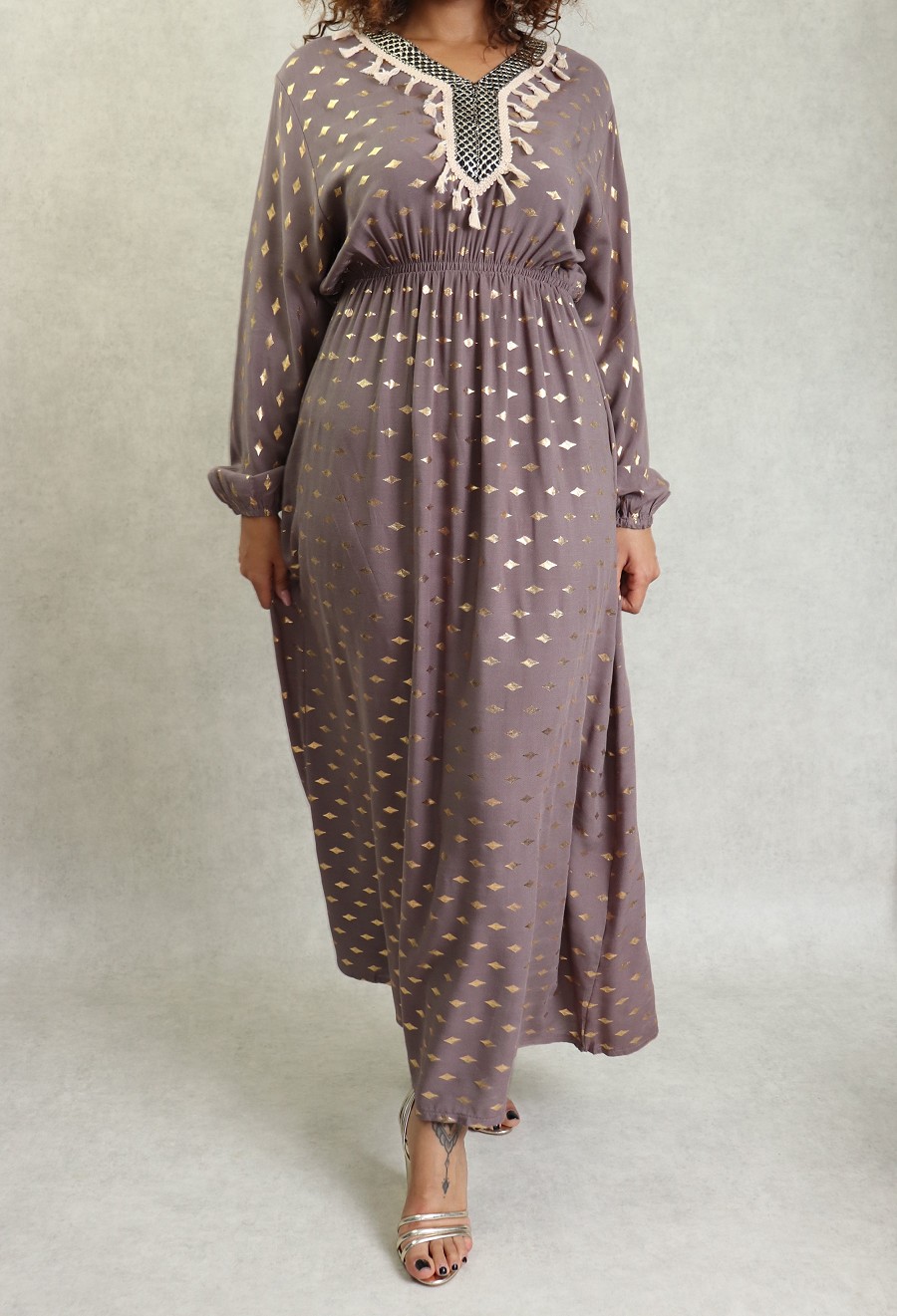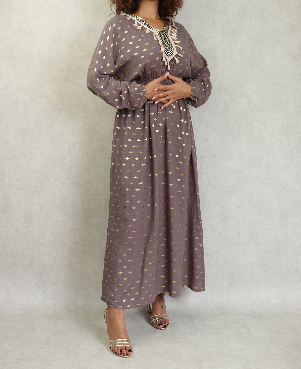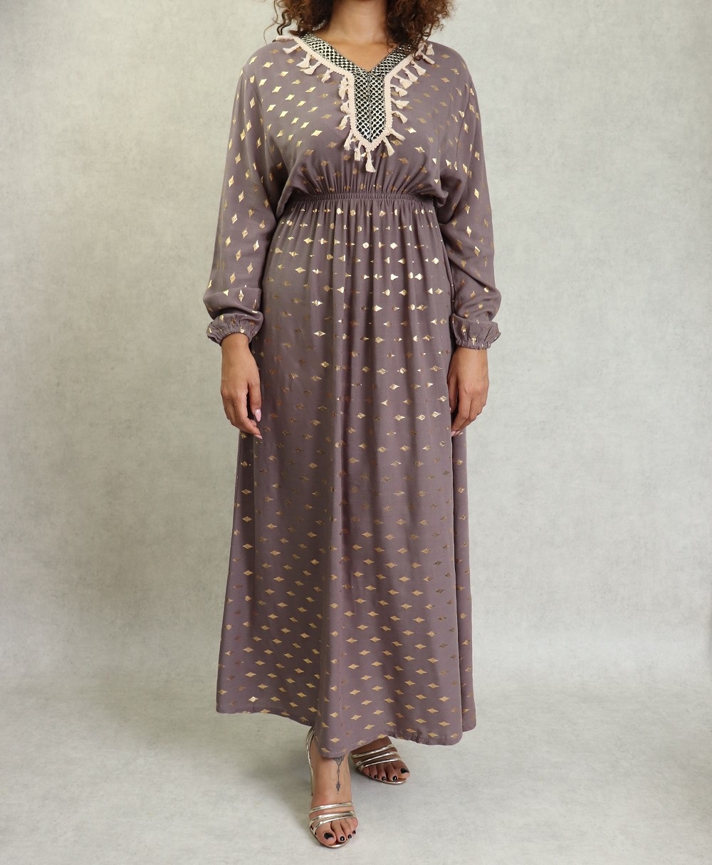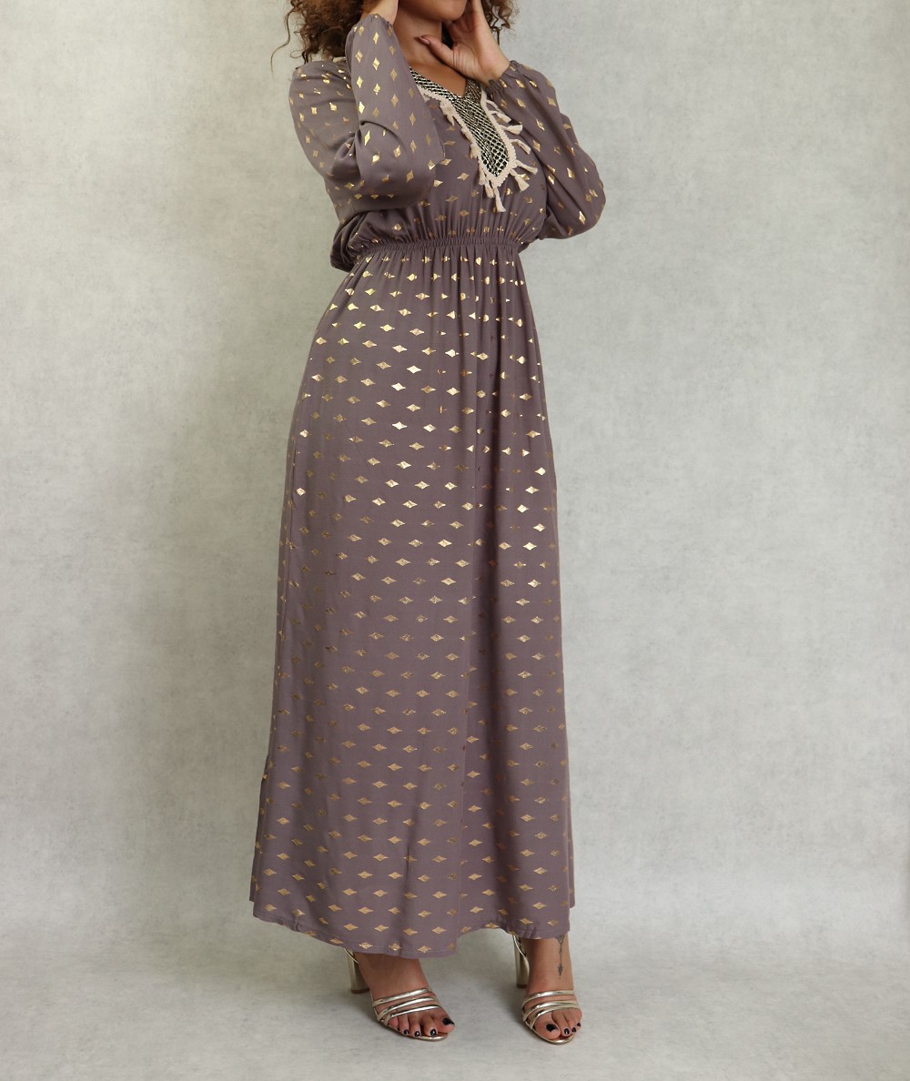 Robe longue, col en V, manches longues, poignets élastiques. Motifs dorés, coupe évasée, taille cintrée et élastique, matière légère et fluide,