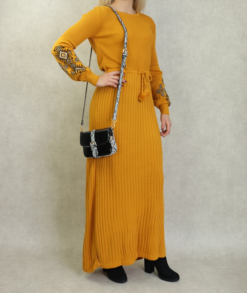 Robe longue en maille fine manche longue pour femme (Saison Automne - Hiver) - Couleur Jaune moutarde