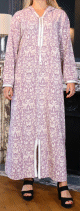 Robe fluide style djellaba marocaine avec capuche motifs fleurie violet sur un fond couleur beige - REF. 33578 (28.00 €) - En Promotion à 24.90 €