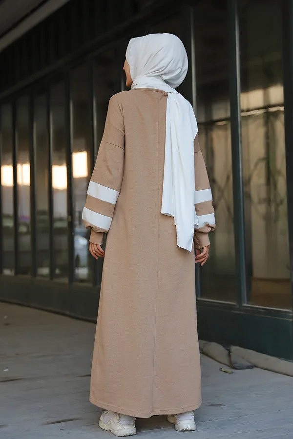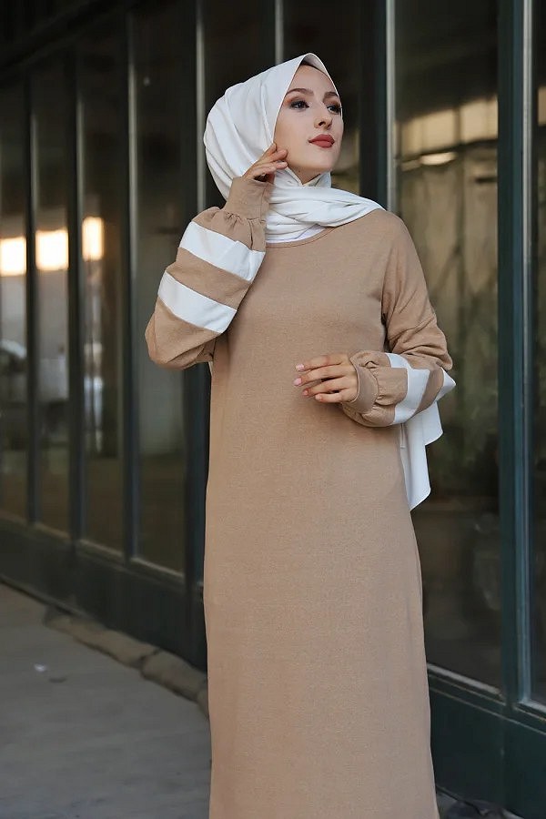 Robe longue, col rond, manches longues légèrement bouffantes, coupe droite.