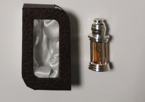 Parfum concentré sans alcool "Musk Ambre" dans une jolie bouteille argentée avec le bouchon qui se vise orné d'un diamant.