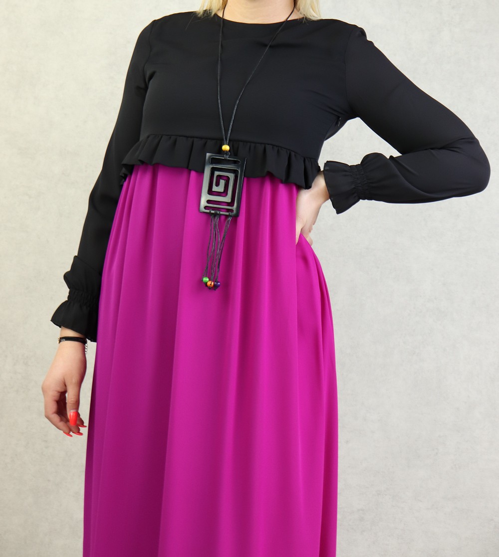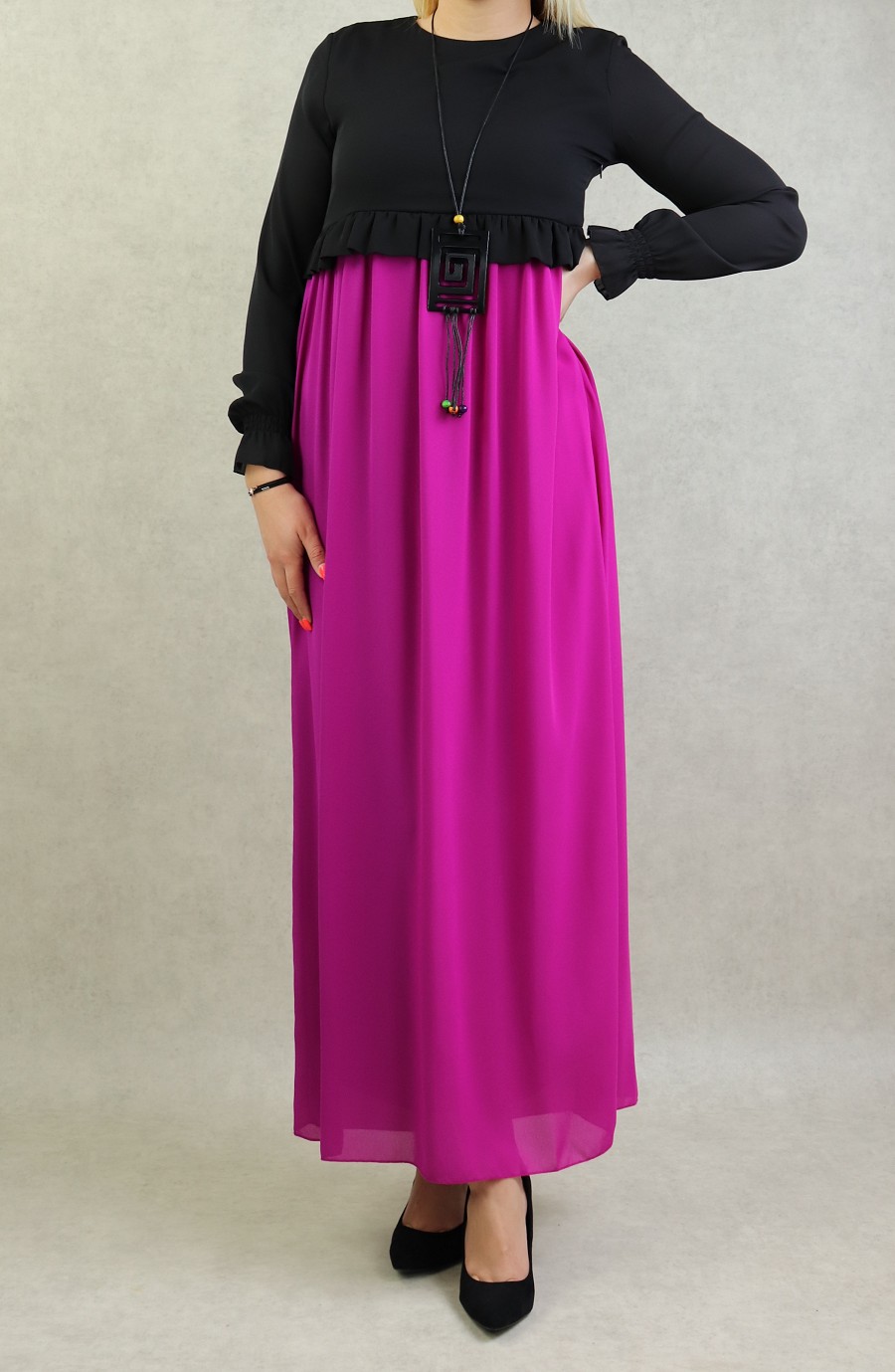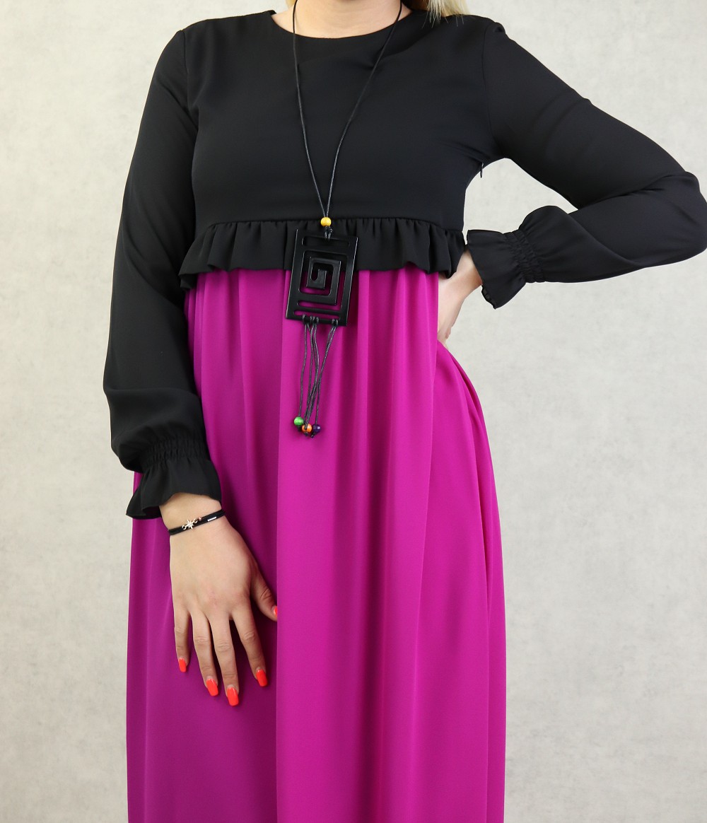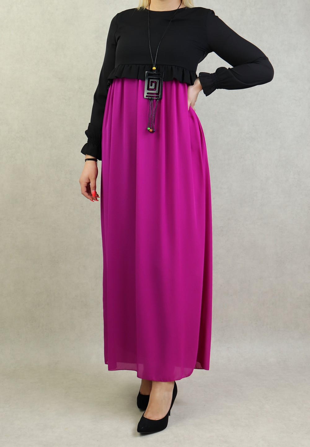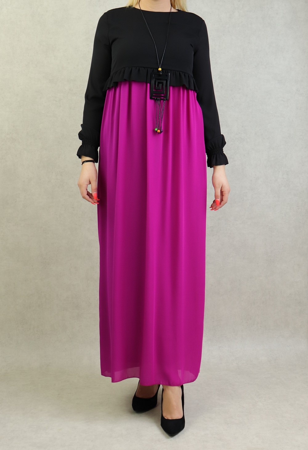 Robe longue, col rond, manches finition élastique aux poignets, bouton de fermeture au dos; glissière sur le coté, taille cintrée. Coupe droite, tissu effet mousseline, aéré et fluide, non transparent.