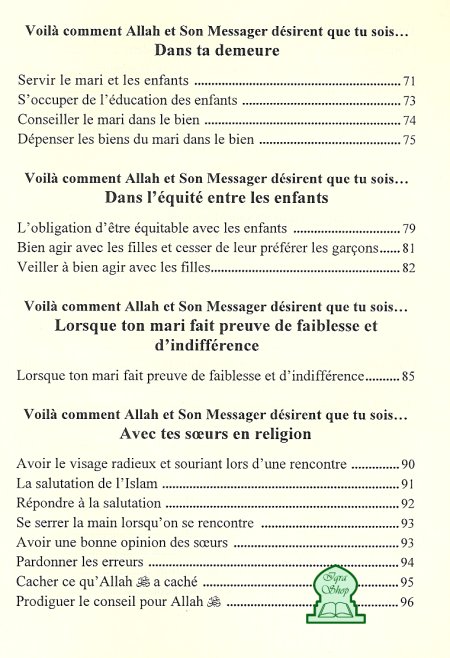 Cet ouvrage est un rappel non sans intérêt pour les musulmanes vertueuses et les croyantes pieuses quand à l'attitude générale qu'elle doivent adopter. Il se distinguent de la plupart des écrits publiés à ce sujet par son côté pratique et ses nombreux conseils qui ne manqueront pas d'éclairer celles qui désirent améliorer leur vie quotidienne dans l'obéissance de leur Seigneur.
