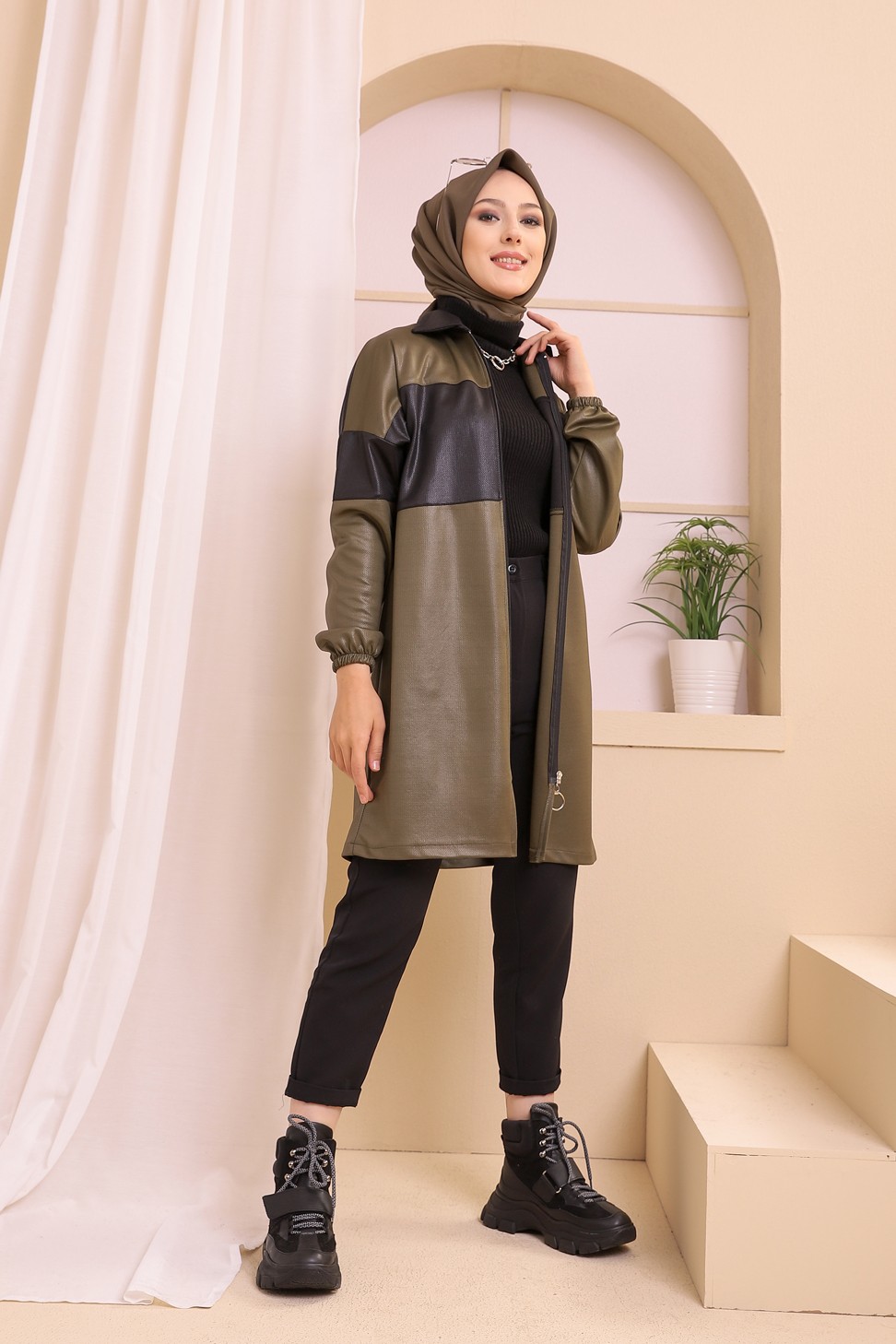 Veste tunique zippée en skaï simili-cuir pour femme (Vêtement Hijab Automne Hiver Style) - Couleur kaki Vetement & Accessoire