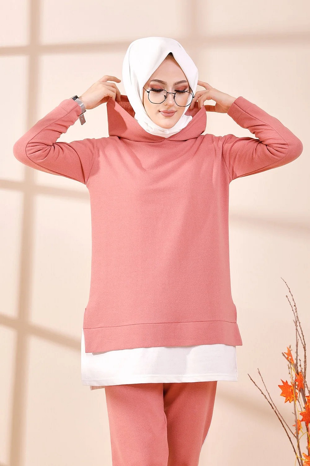 Survêtement deux pièces composé d'un sweat à capuche, coupe droite et d'un pantalon taille élastique. Le Sweat-shirt est rallongé avec extension de couleur blanche.