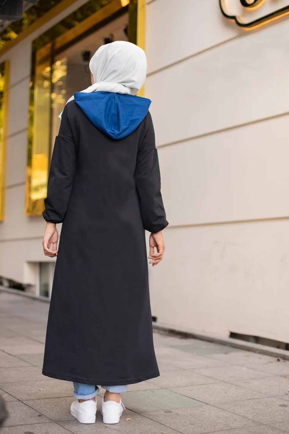 Cardigan long à capuche, coupe classique, manches longues finition avec élastique, fermeture zippée devant. Tenue décontractée chic et moderne.