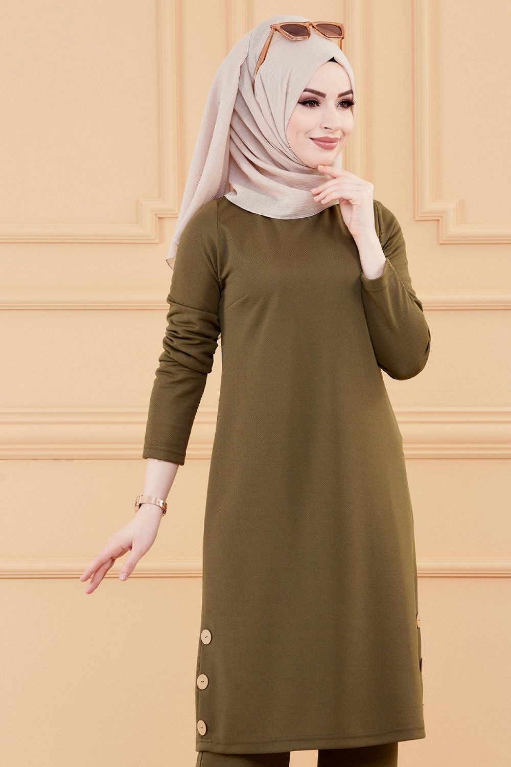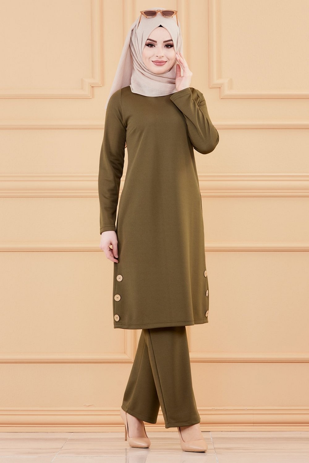 Ensemble tunique à boutons et pantalon assorti pour femme (Vetement mastour pour hijab) - Couleur kaki Vetement & Accessoire