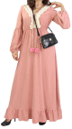 Robe Marocaine longue avec strass dorée et nombreuses broderies sur le buste et toute la longueur ; style caftan. Tissu doux de type coton/soie. Le double avantage de ce modèle est d'être confortable et élégant à la fois.