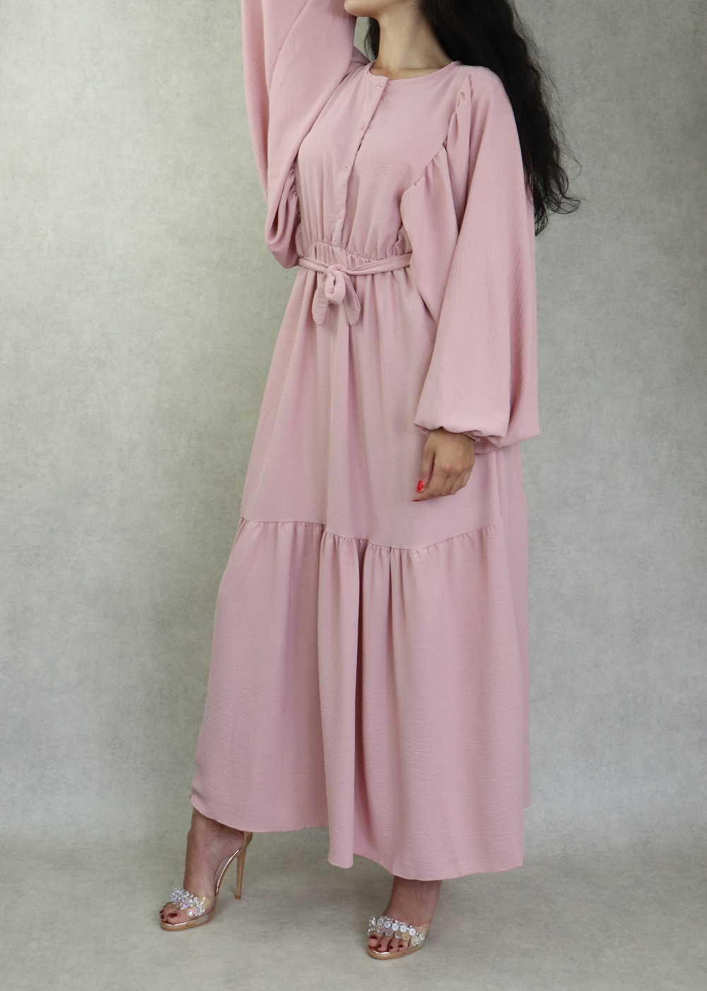 Robe longue, col rond, fermeture boutons sur le buste, taille élastique munie d'une ceinture, tissu fluide, léger et opaque. Manches longues amples esprit chauve-souris resserrées aux poignets.