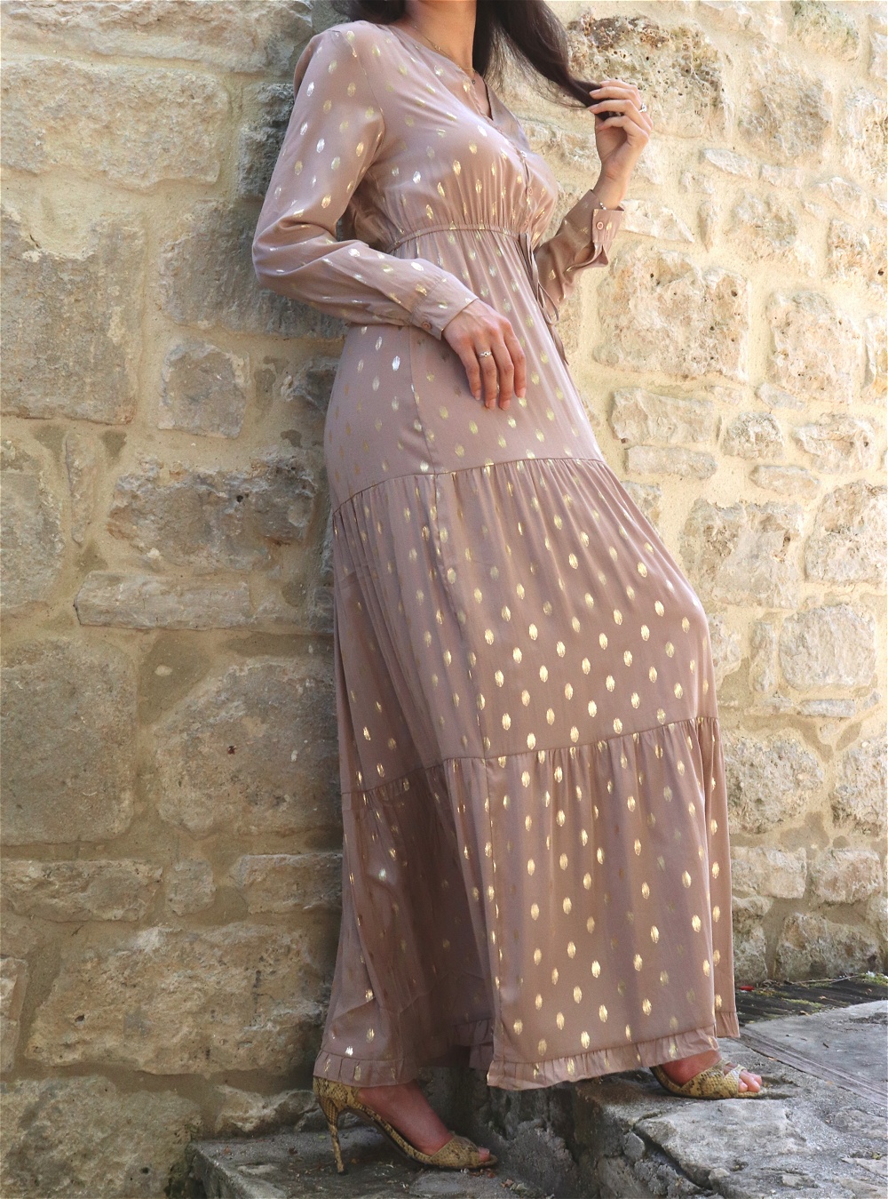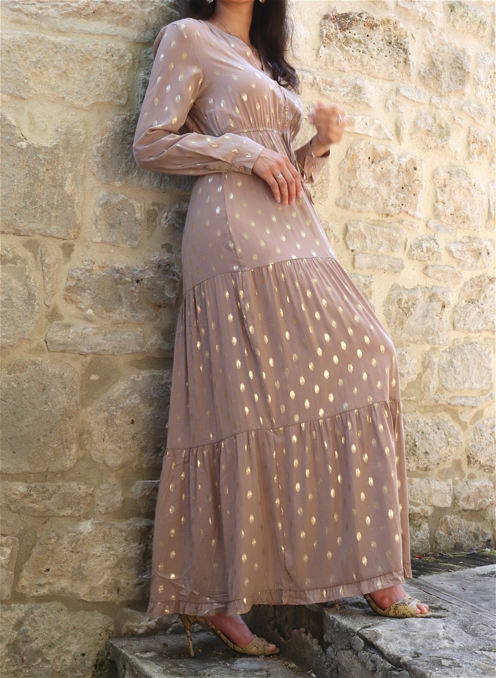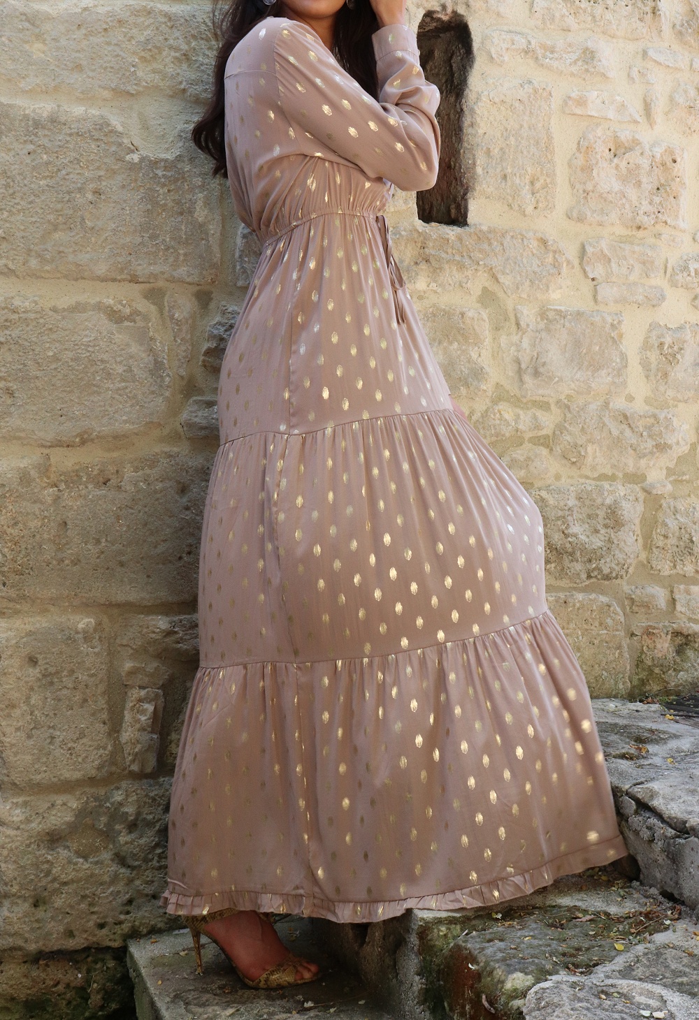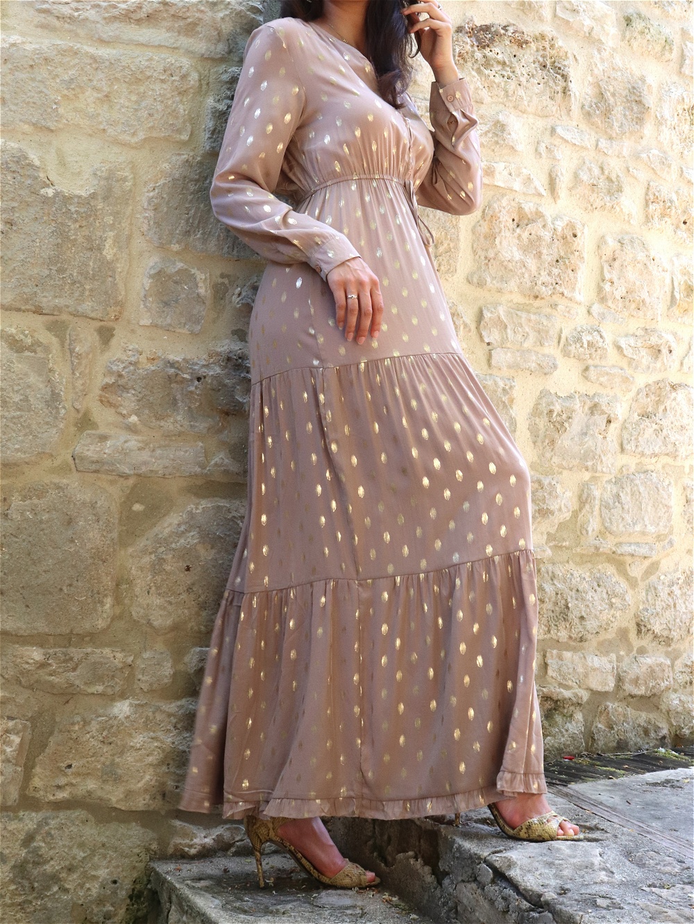 Magnifique Robe longue, col en V, manches longues, poignets boutonnés, coupe évasée, taille cintrée et élastique, tissu très légère et fluide.