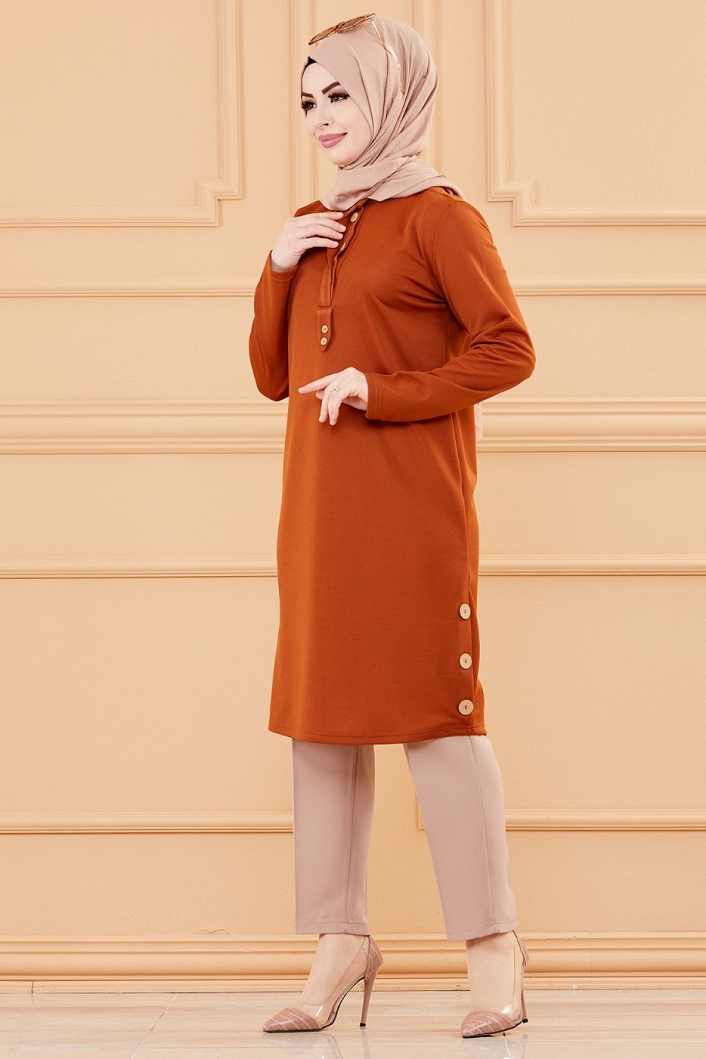 Ensemble tunique boutonnée et pantalon assorti (Vêtement femme voilée Turquie) - Couleur vison - REF. 36017 (36.90 €)
