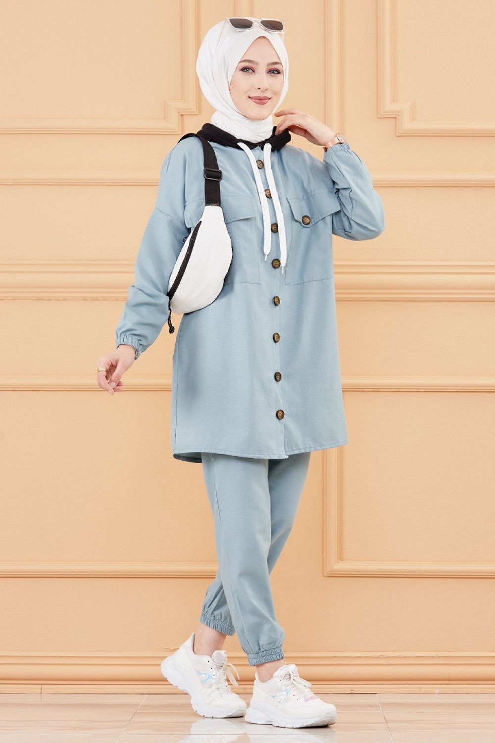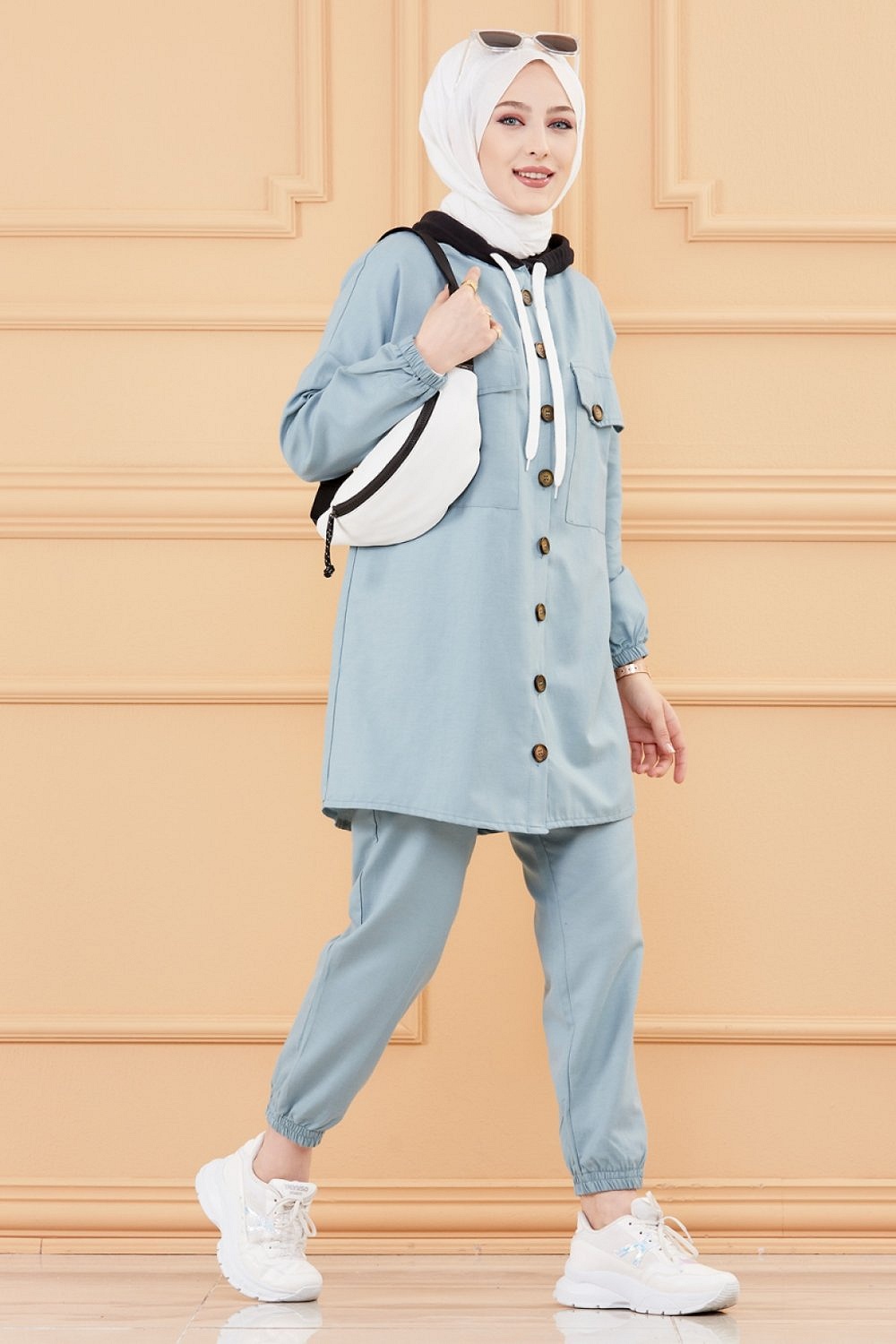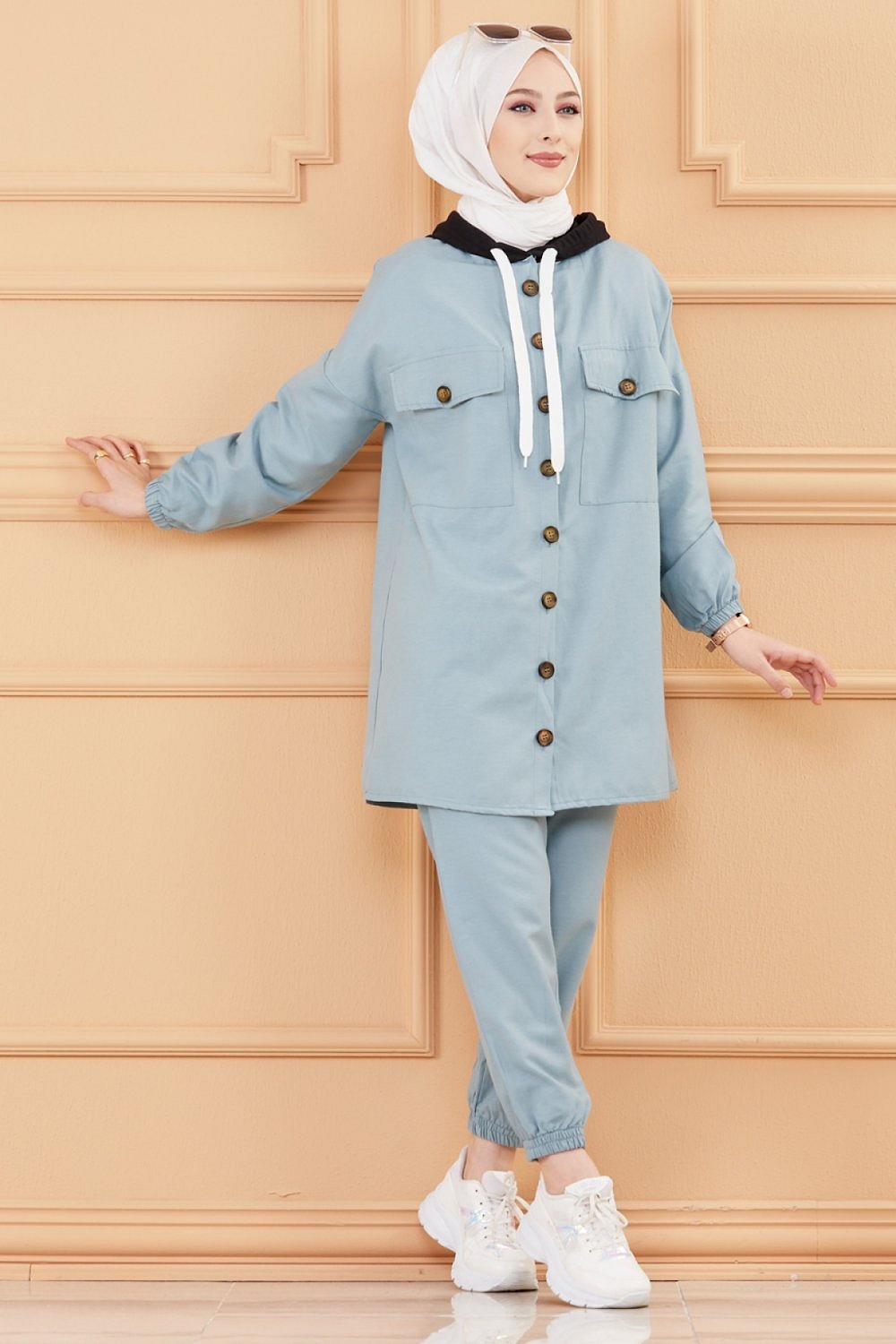 Ensemble décontracté pour la vie de tous les jours avec sa veste ample à capuche et son pantalon assorti.