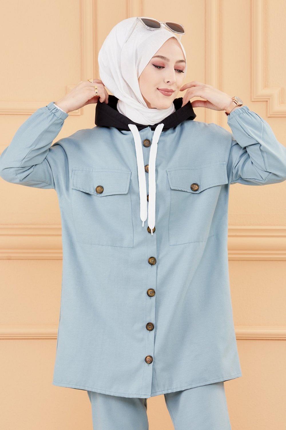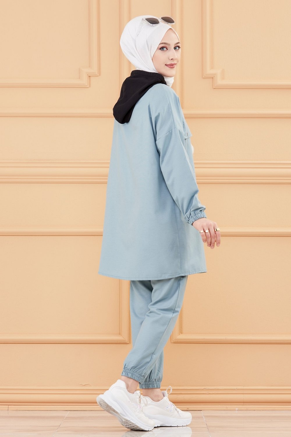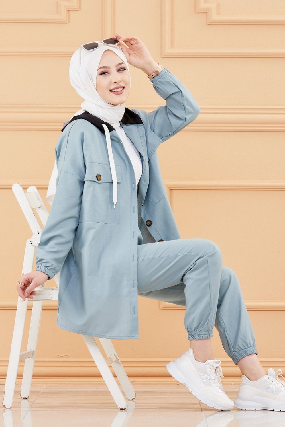 Ensemble décontracté pour la vie de tous les jours avec sa veste ample à capuche et son pantalon assorti.
