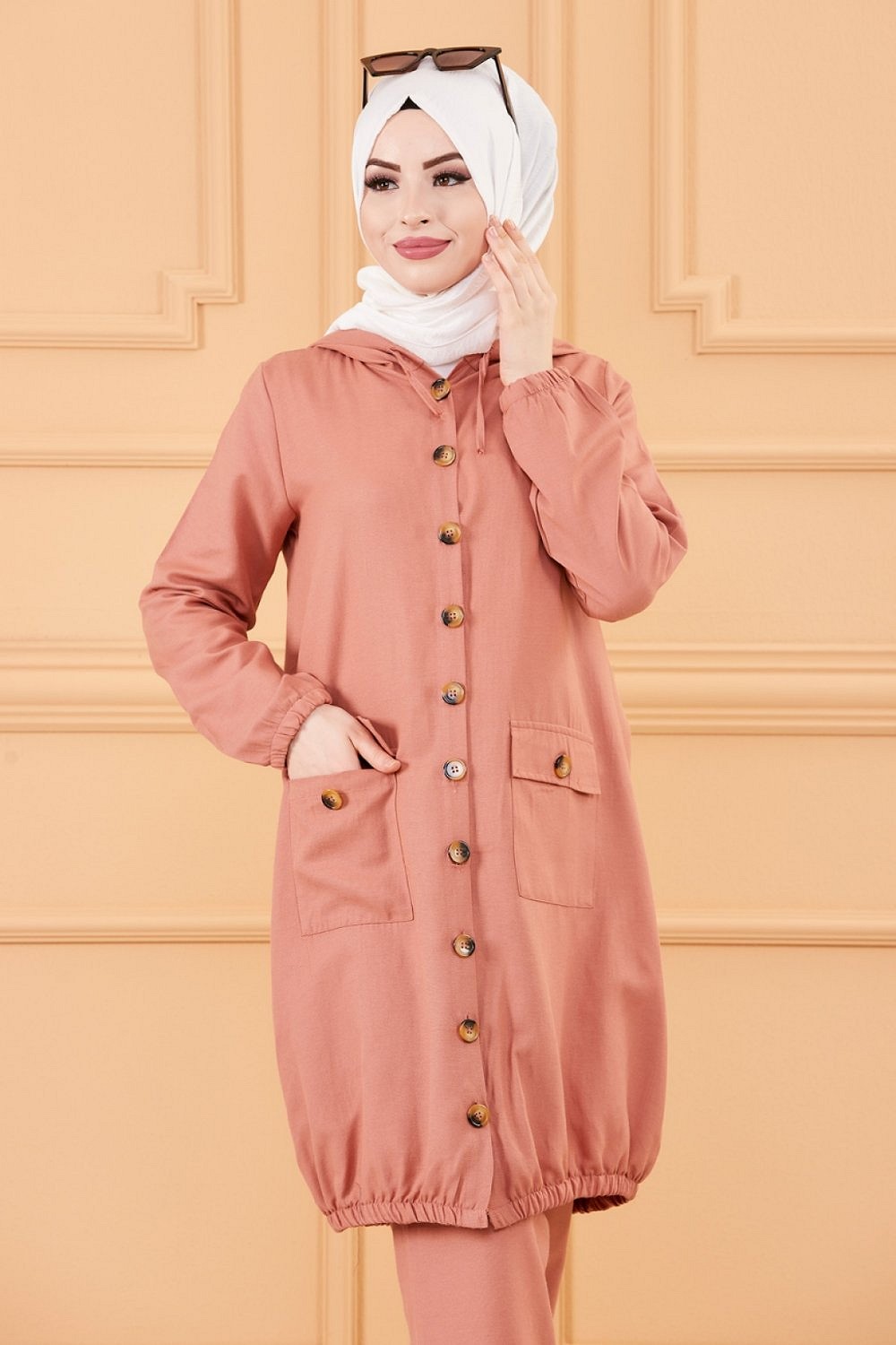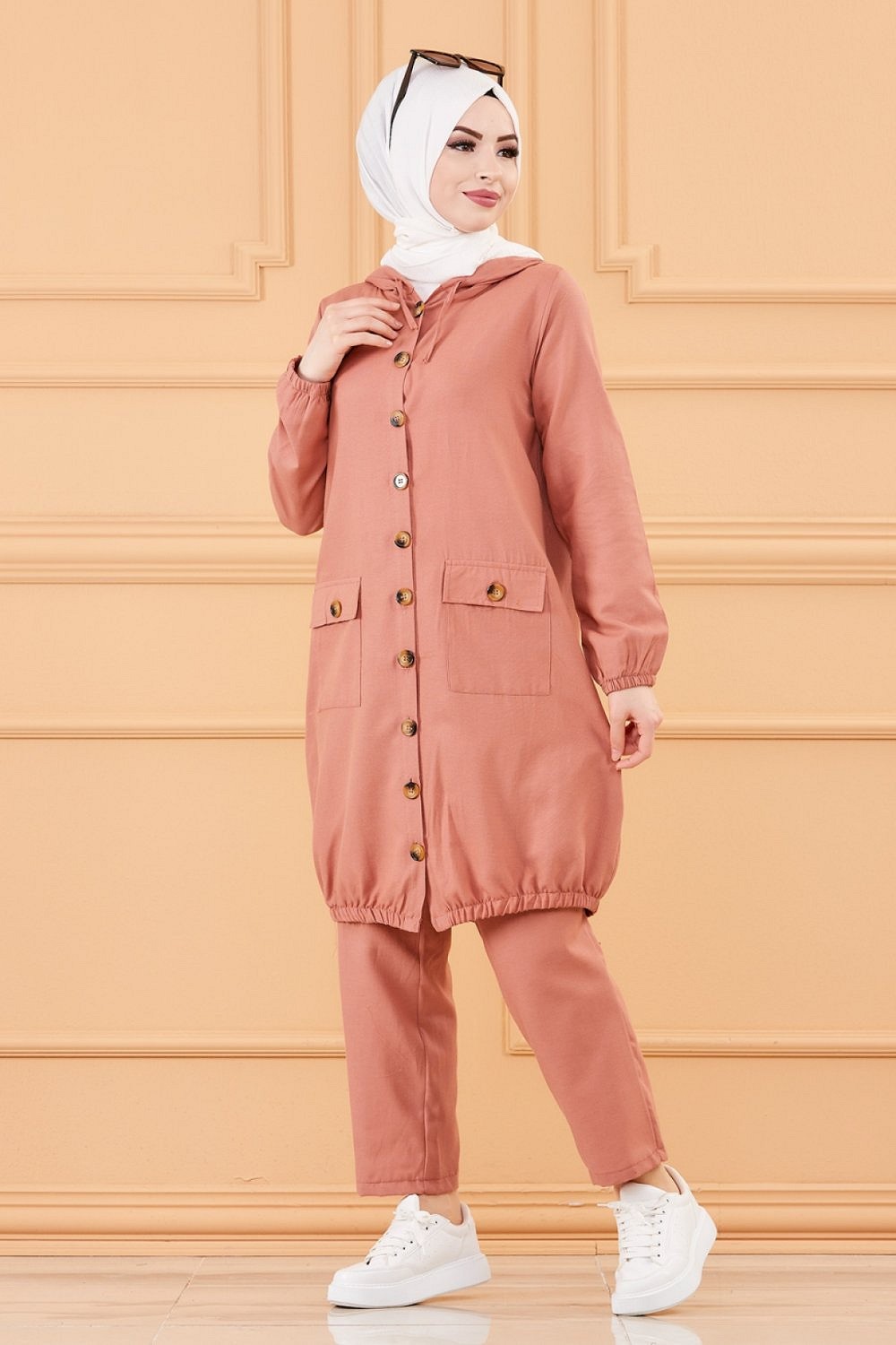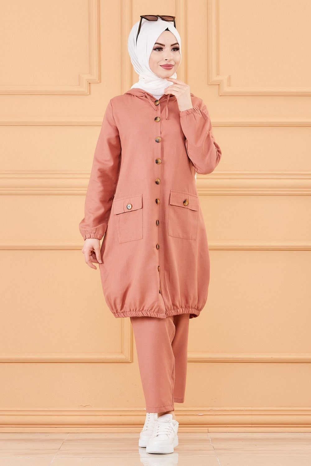 Veste ample évasée à capuche et son pantalon assorti.