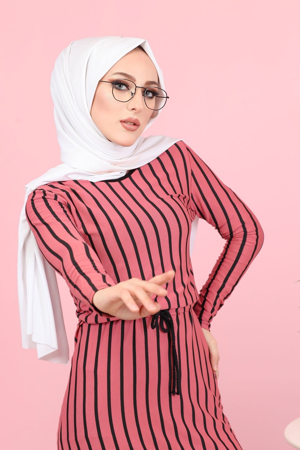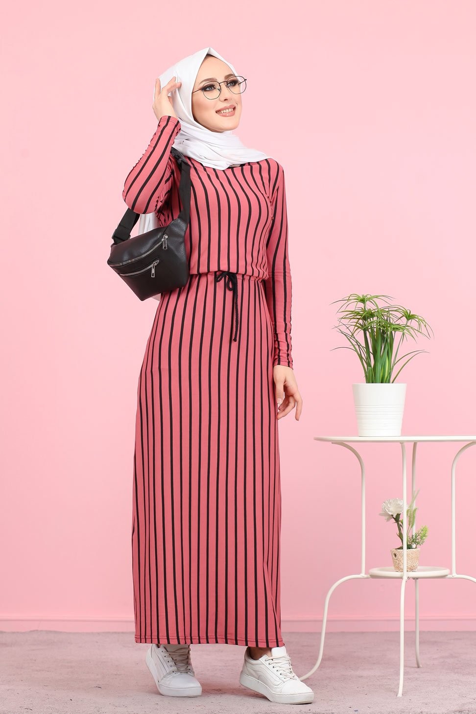 Robe maxi-longue à rayures noires mode décontracté ceinture intégrée - Couleur fuchsia Vetement & Accessoire