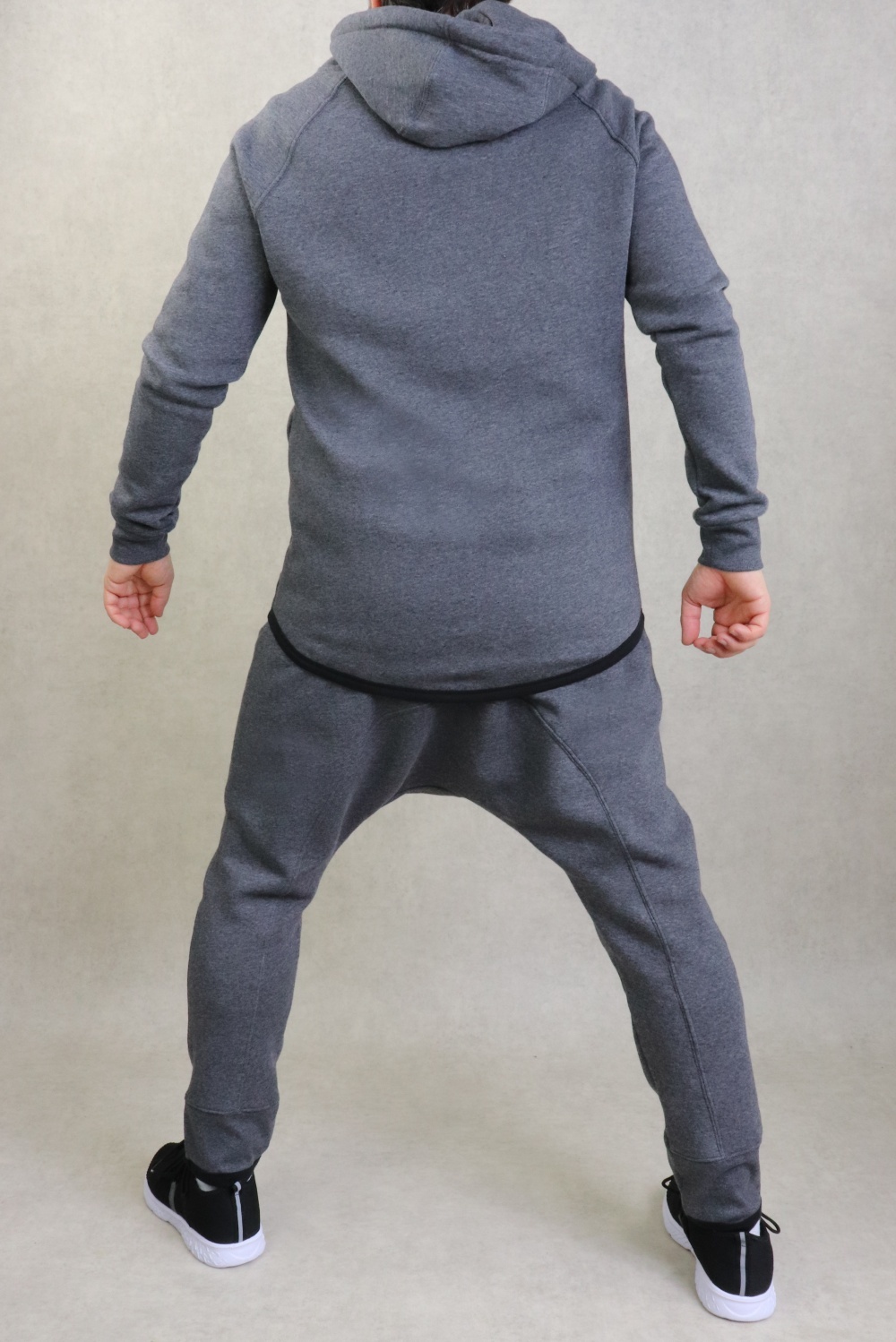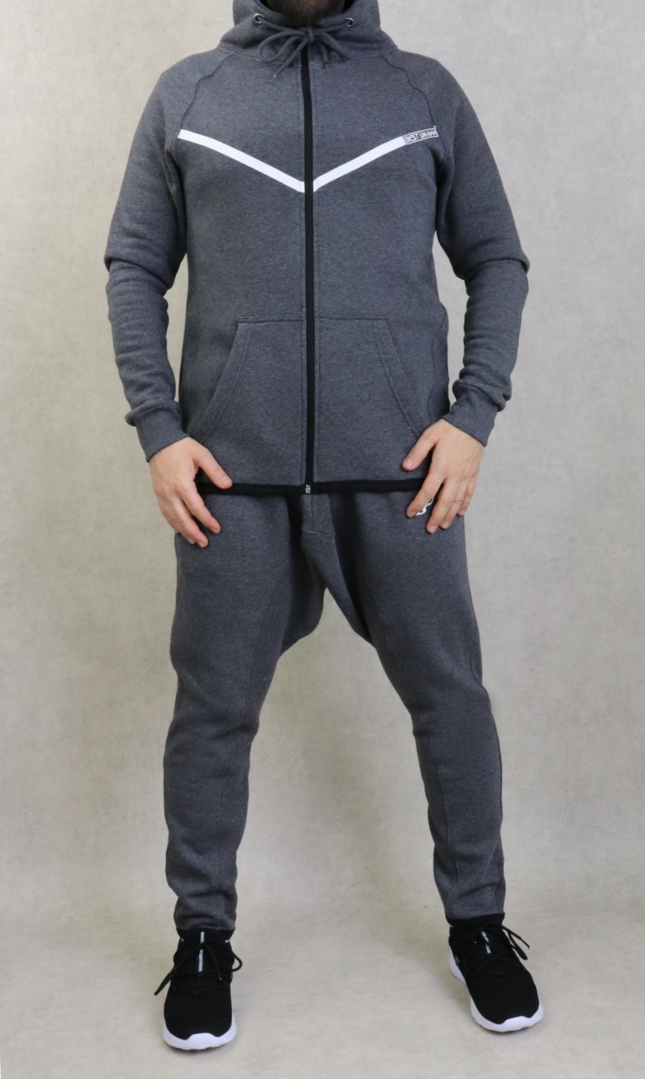 Ensemble deux pièces constitué d'une veste couleur gris foncé chiné, plus longue à l'arrière qu'à l'avant avec bandes blanches et inscription BEST UMMAH. Deux poches sur les côtés. Capuche doublée avec cordon.