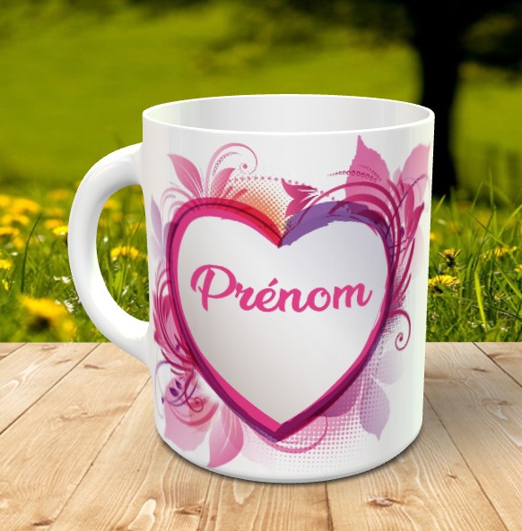 Mug cur fleuri rose avec 2 prenoms - Tasse cadeau personnalisee avec chaque prenom dans un coeur