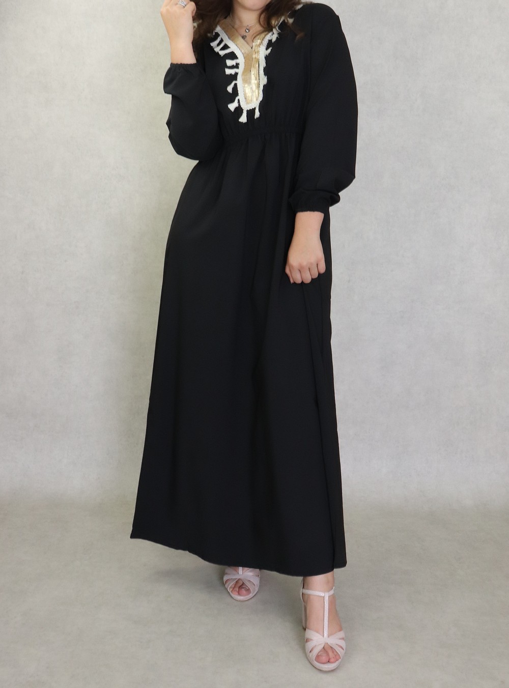 Robe longue féminine avec décoration écailles dorées et pompons - Couleur Noir Vetement & Accessoire