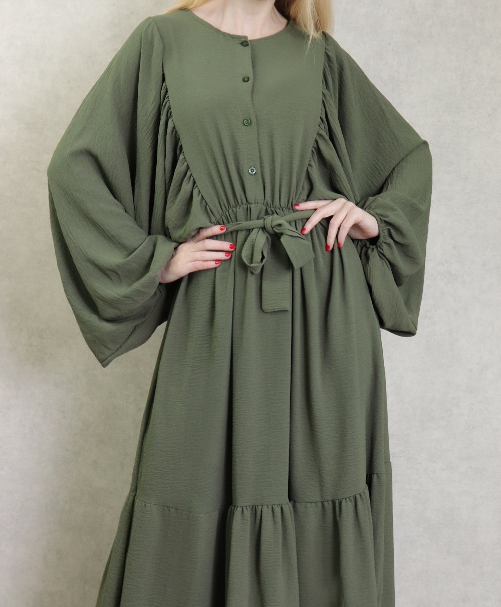 Robe longue, col rond, fermeture boutons sur le buste, taille élastique munie d'une ceinture, tissu fluide, léger et opaque. Manches longues amples esprit chauve-souris resserrées aux poignets.