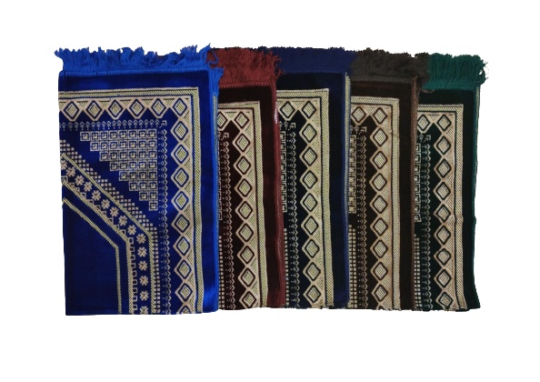 Tapis en velours avec borderies et illustration de la direction de la prière.