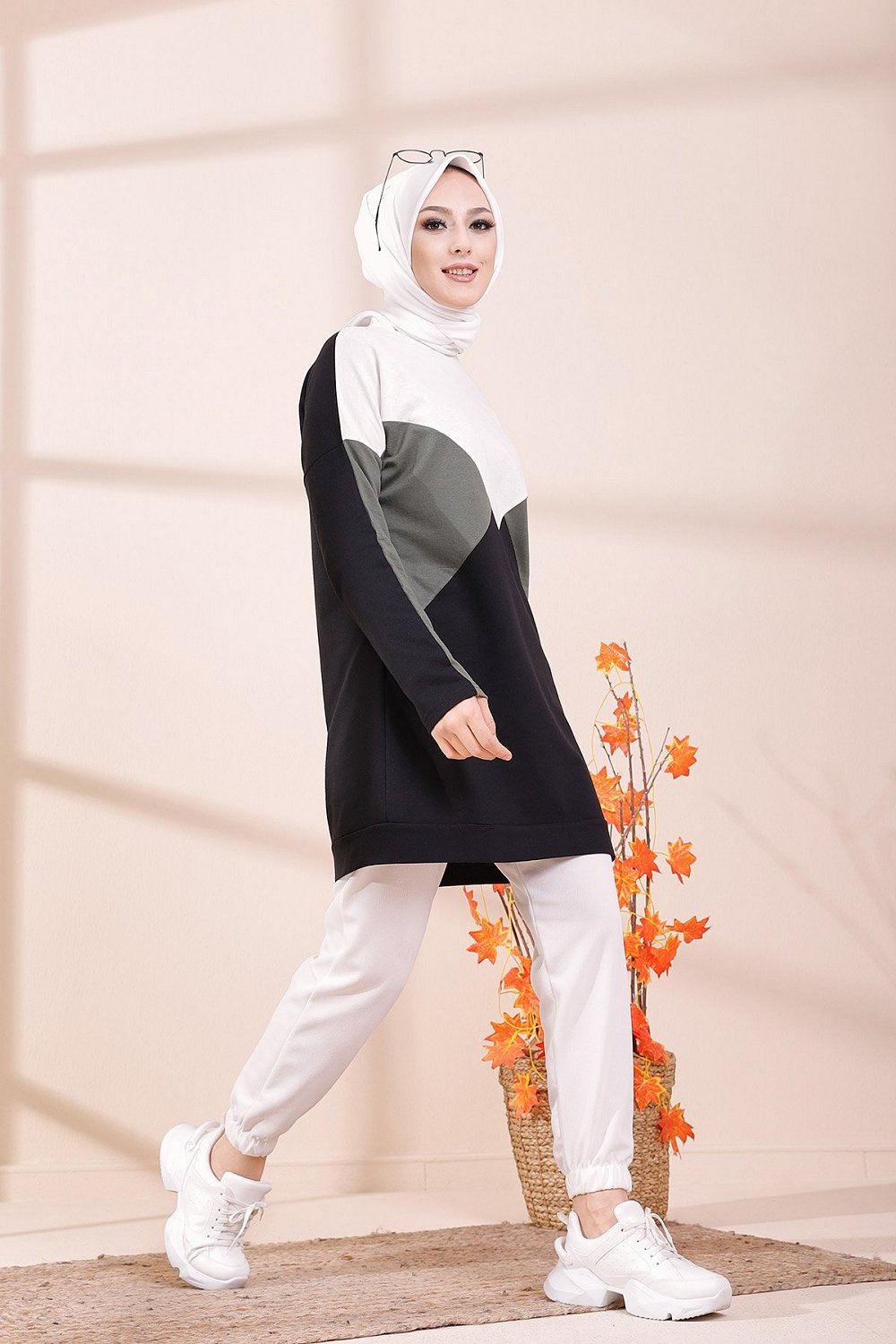 Tunique à capuche tricolore (Vêtement décontracté moderne pour femme voilée) - Couleur noir, blanc et vison - REF. 35564 (24.00 €)
