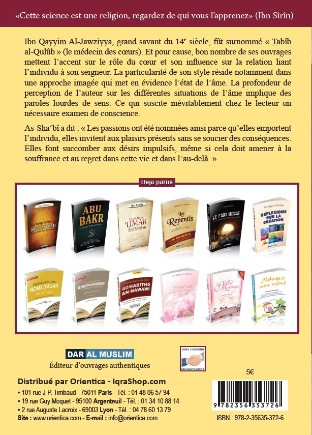 Ibn Qayyim Al-Jawziyya, grand savant du 14e siècle, fût surnommé "Tâbib al Qouloub" (le médecin des coeurs). Et pour cause, bon nombre de ses ouvrages mettent l'accent sur le rôle du coeur et son influence sur la relation liant l'individu à son Seigneur. La particularité de son style réside notamment dans une approche imagée qui met en évidence l'état de l'âme.La profondeur de perception de l'auteur sur les différentes situations de l'âme implique des paroles lourdes de sens. Ce qui sucite inévitablement chez le lecteur un nécessaire examen de conscience. Cette étude détaillée lui permet d'avoir une plus juste connaissance de son état spirituel et d'accomplir un meilleur contrôle de soi (mourâqabat ennafs).Ibn Al-Qayyim est un auteur dont les ouvrages sont incontournables pour quiconque souhaite cheminer vers une éducation spirituelle digne de ce nom. Aussi, l'ouvrage que nous vous présentons est une compilation des paroles de l'imam et s'inscrit tout à fait dans ce cadre.