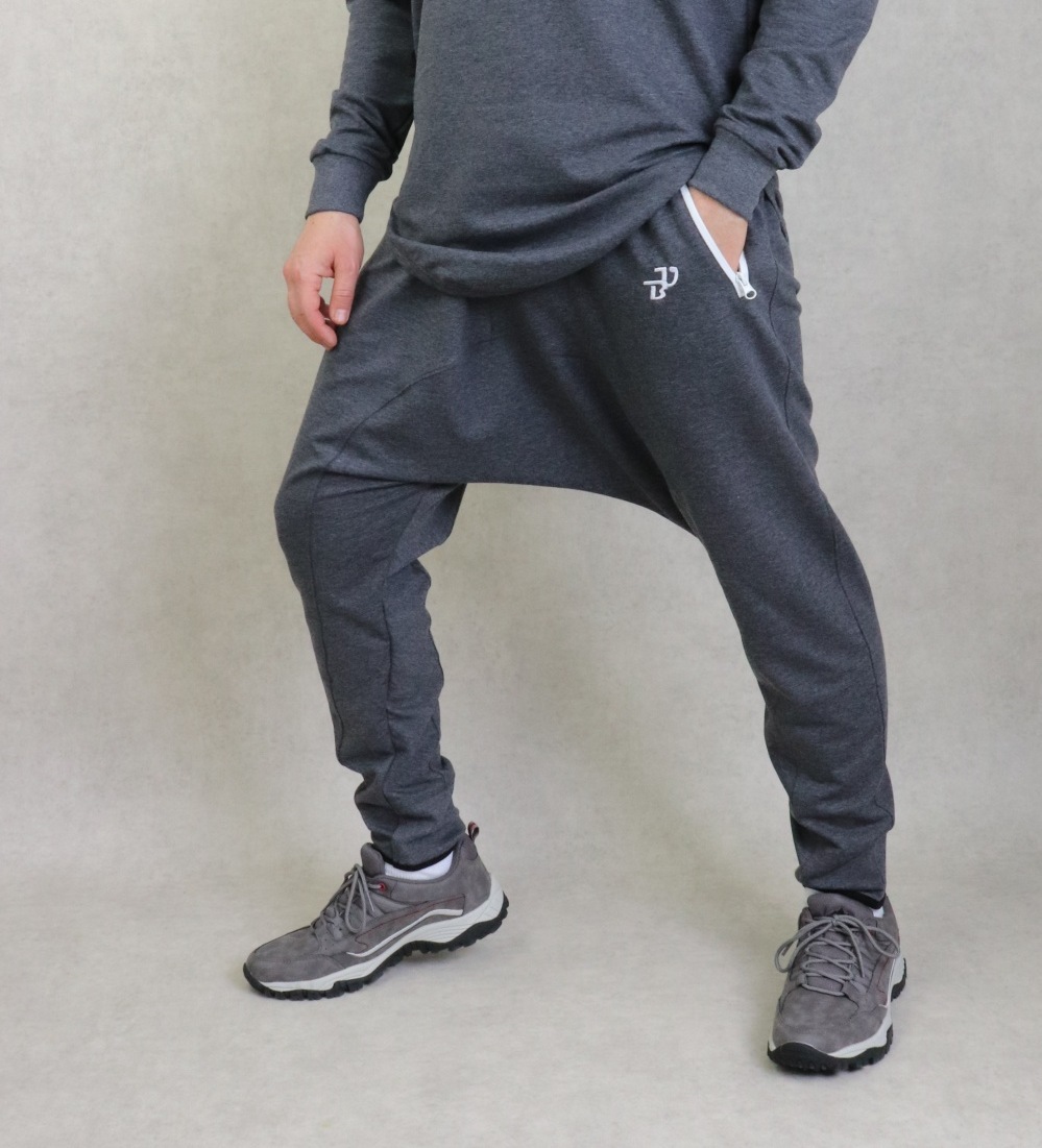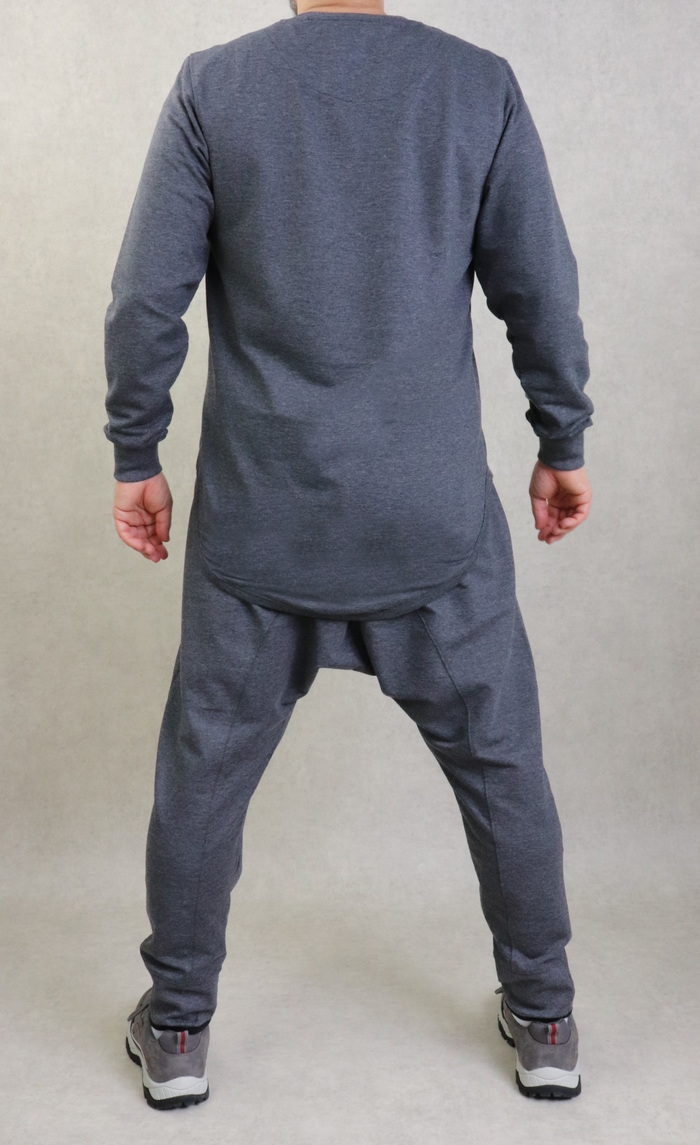 Esemble deux pièces constiuté d'un sweat longline et d'un sarouel large et long couleur gris foncé chiné. Deux poches zippées latérales et une poche arrière zippée de couleur blanche. Tissu jogging léger type coton stretch. Bande noire au niveau des chevilles. Braguette zippée. Brodé logo BU (Best Ummah).