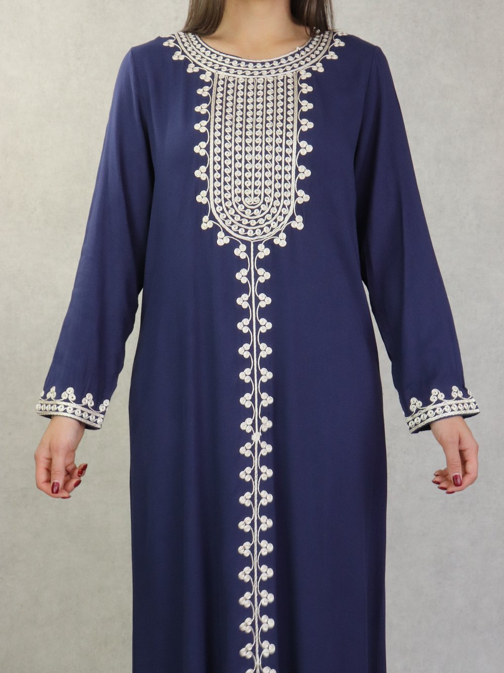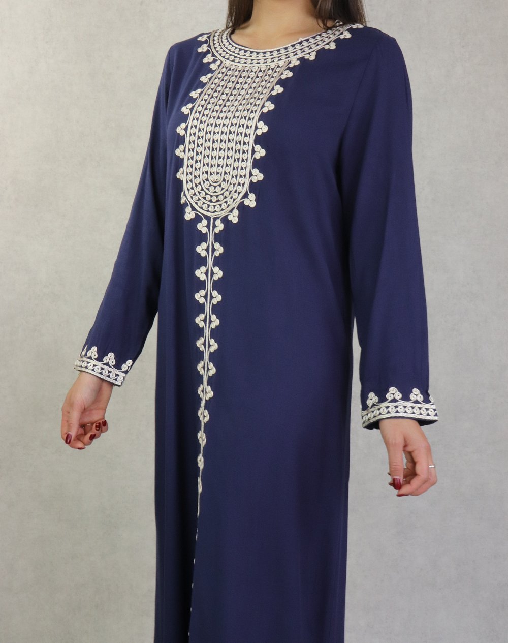 Robe longue avec nombreuses broderies assorties sur les manches et sur le buste et toute la longueur. Col rond, coupe droite, tissu léger et fluide. Ce modèle classique et sobre, sera parfait pour le quotidien, son style et sa matière vous mettront tout de suite à l'aise.