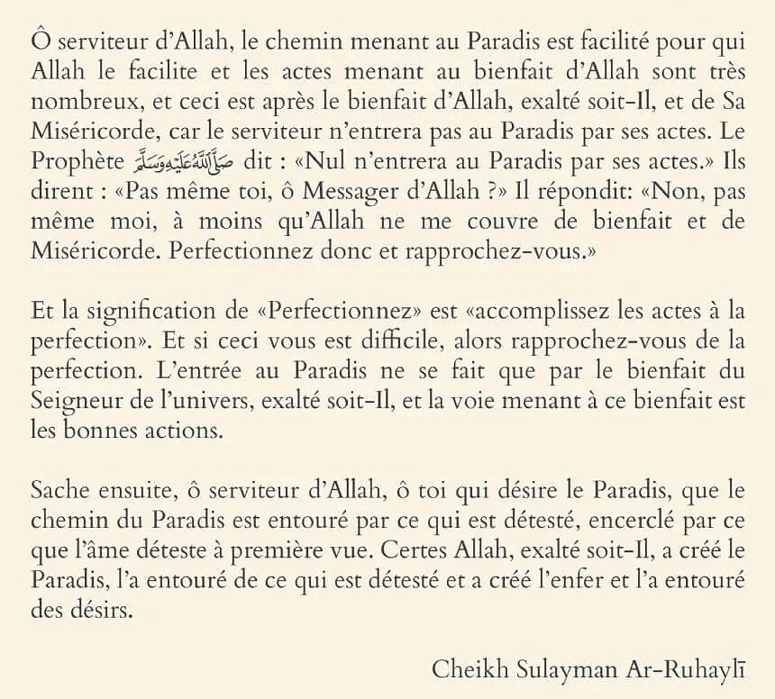 Ô serviteur d’Allah, le chemin menant au Paradis est facilité pour qui Allah le facilite et les actes menant au bienfait d’Allah sont très nombreux, et ceci est après le bienfait d’Allah, exalté soit-Il, et de Sa Miséricorde, car le serviteur n’entrera pas au Paradis par ses actes. Le Prophète (paix et salut sur lui) dit : « Nul n’entrera au Paradis par ses actes. » Ils dirent : « Pas même toi, ô Messager d’Allah ?» Il répondit : « Non, pas même moi, à moins qu’Allah ne me couvre de bienfait et de Miséricorde. Perfectionnez donc et rapprochez-vous. »