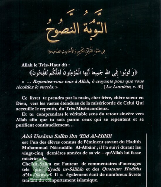 Allah le Très-Haut dit : …Repentez-vous tous à Allah, ô croyants pour que vous récoltiez le succès. [La Lumière, V.31] Ce livret te prendra par la main, cher frère en Dieu, chère sœur, vers les vastes étendues de la miséricorde de Celui Qui accueille le repentir, du Très Miséricordieux. Et tu comprendras le véritable sens du retour sincère vers Allah afin que tu sois parmi ceux qui se repentent et se purifient continuellement. Abû Ussâma Salîm ibn 'Eid Al-Hilâlî est l'auteur d'un commentaire du fameux Riyâdh us-Sâlihîn, et de nombreux livres traitant du comportement islamique. Il est un des élèves connus et reconnus de l'éminent savant du hadith, Muhammad Nâsruddîn Al-Albânî et l'a suivi dans les vingt dernières années de sa vie - qu'Allah lui fasse miséricorde.
