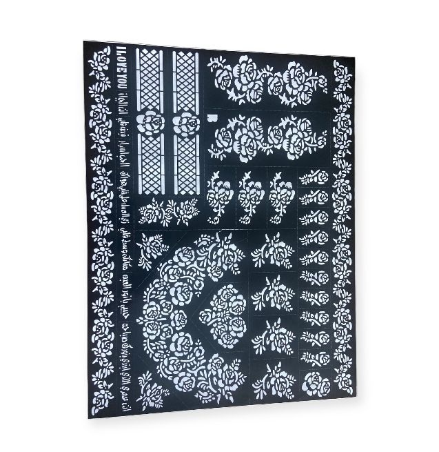 Cette feuille contient des pochoirs assortis pour réaliser des tatouages au henné artistiques et étendus (mains, bras, etc.). Idéal pour créer facilement des tatouages temporaires.