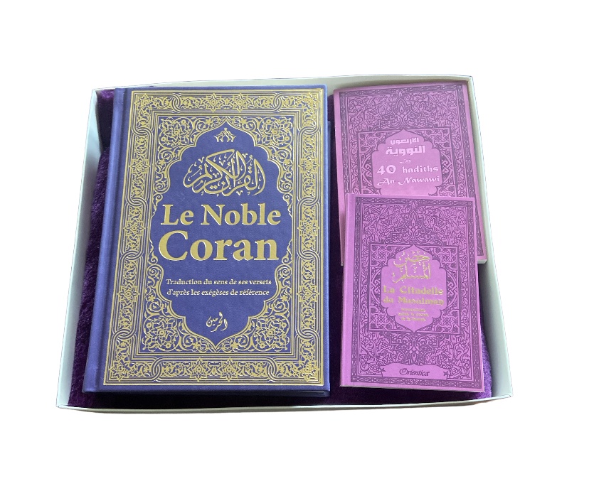 Pack Cadeau Mauve : Le Noble Coran avec couleurs Arc-en-ciel (Rainbow), La Citadelle du Musulman, Le Prophète Muhammad (SAW) et la femme, Tapis uni en velours, Diffuseur de parfum (assortis) - REF. 24134 (39.90 €) - En Promotion à 35.00 €