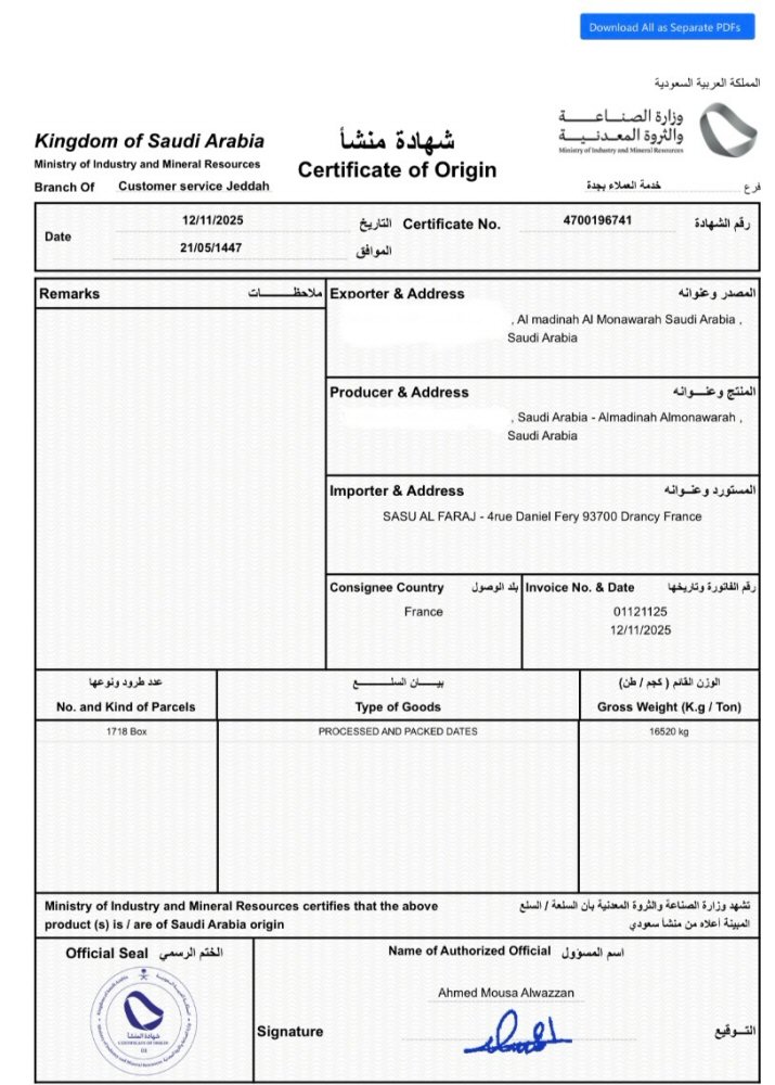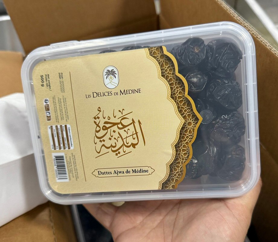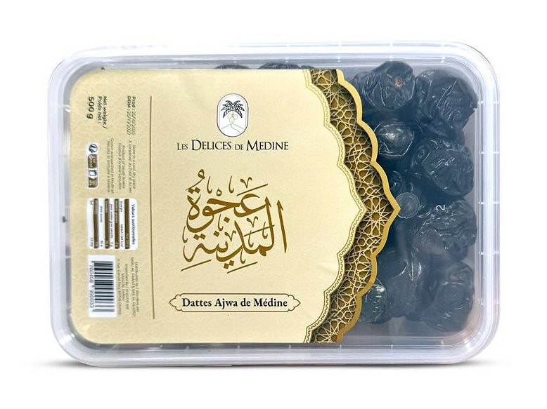 Dattes Al-Ajwa de Médine (Arabie Saoudite) emballées dans une boite hermétique, qualité Bio.D’après Sa’d ibn abi Waqass le Prophète (SAW) dit : « Celui qui déjeune le matin avec sept dattes de al-‘Ajwa,rien ne pourra lui nuire ce jour-là, ni poison et ni sorcellerie » Rapporté par Boukhari (n°5768) et Mouslim (n°2047).Cheikh ibn Bâz a dit dans le précepte de la religion sur la sorcellerie et la divination : al’Adjwa est une espèce de dattes qui poussent dans la ville de Médine, dont la forme est plus grande que le Sîhâni et d’une couleur plus sombre. Le Prophète -Prières et bénédiction d'Allah sur lui- la planta de sa main, ce qui lui donne des avantages grâce à la bénédiction des plantations du Prophète (SAW).Cette qualité n’est pas limité au temps du Prophète -Prières et bénédiction d'Allah sur lui-, mais les effets guérisseurs d’al ‘Ajwaa continueront jusqu’au Jour de la Résurrection, le Prophète -Prières et bénédiction d'Allah sur lui- l’affirma de son vivant dans le Hadith de Sa’d ibn abi Waqass cité plus haut. Les effets guérisseurs dépassent ceux d’al ‘Ajwa et concernent toutes les dattes de Médine, c’est justement ce qui ressort du Hadith rapporté par Mouslim qui dit : Celui qui déjeune le matin avec sept dattes de ce qui pousse au sein de Médine, ne sera pas affecté par le poison jusqu’au soir.